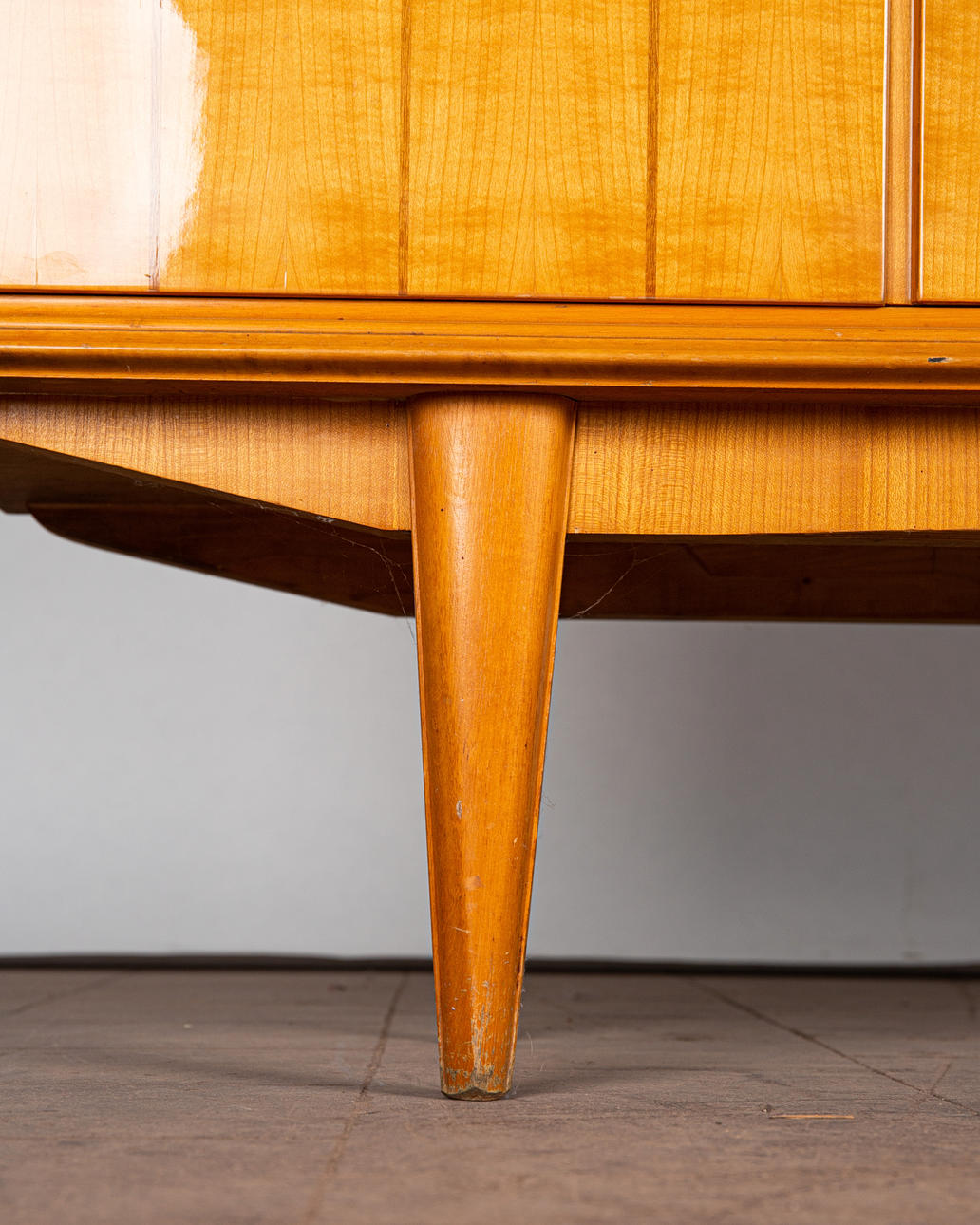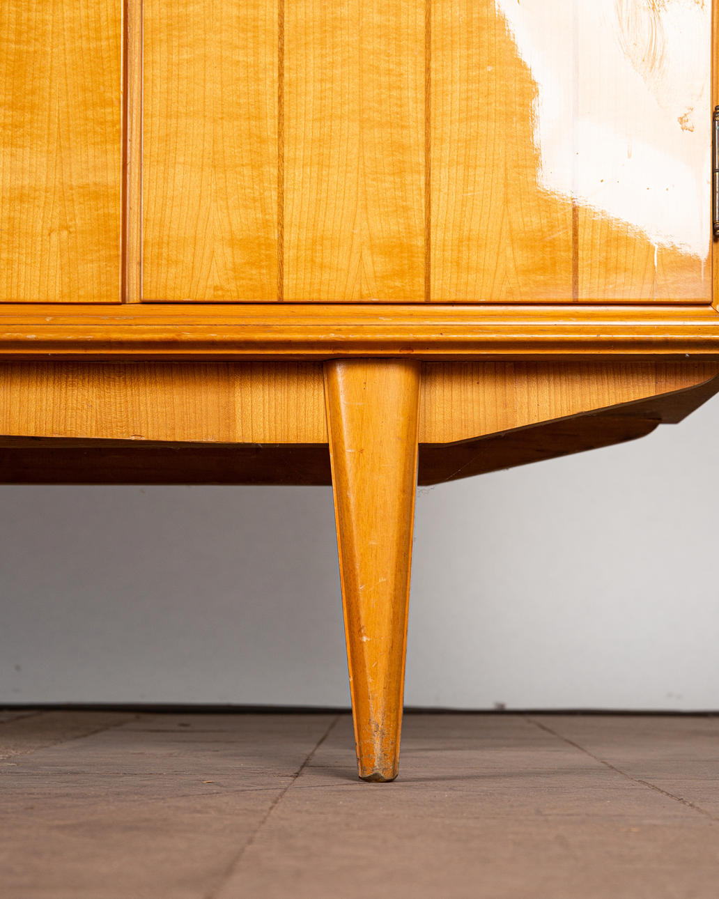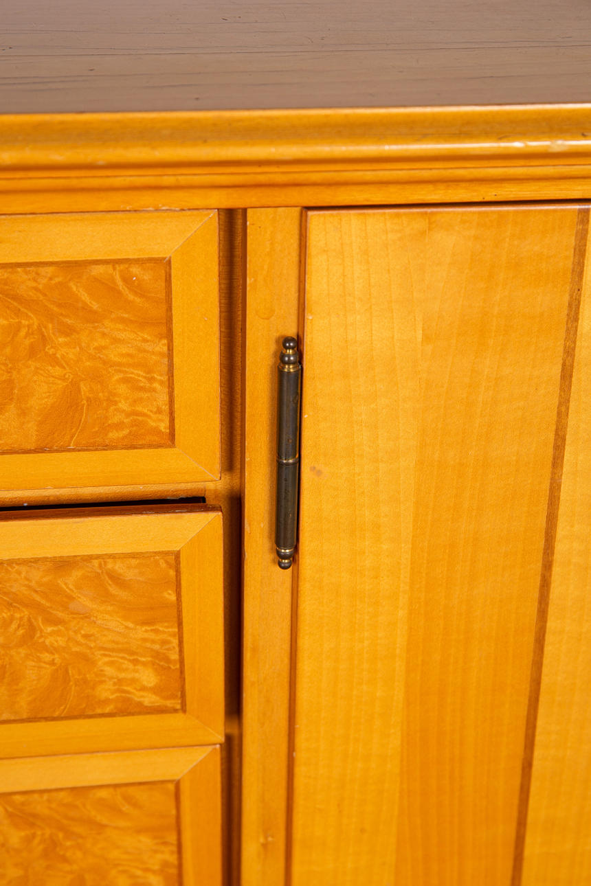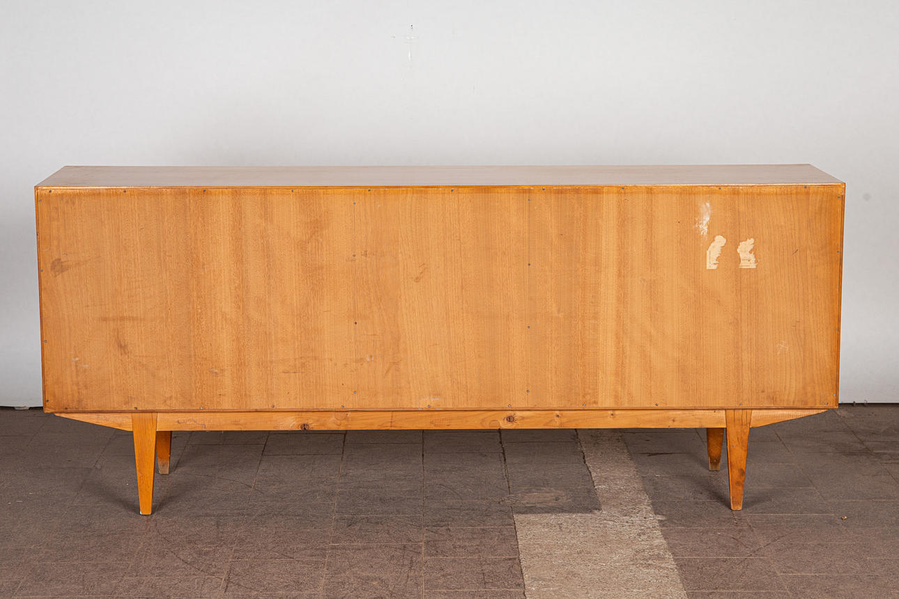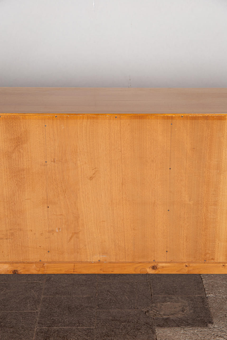 Sideboard, Kirschbaum, Messing, 1950er Jahre. Sideboard mit einem kastenförmigen Korpus aus Kirschbaumholz mit Holzintarsien, rechts und links jeweils mit einer verschließbaren Doppeltür versehen, sowie mittig mit fünf Schüben mit Messinggriffen, oberster Schub verschließbar, zwei Schübe mit grünen Besteckeinlagen versehen, innen mit Einlegeböden ausgestattet, Schlüssel vorhanden, H.93cm, L.220cm, B.48cm.