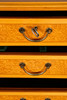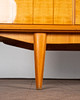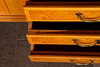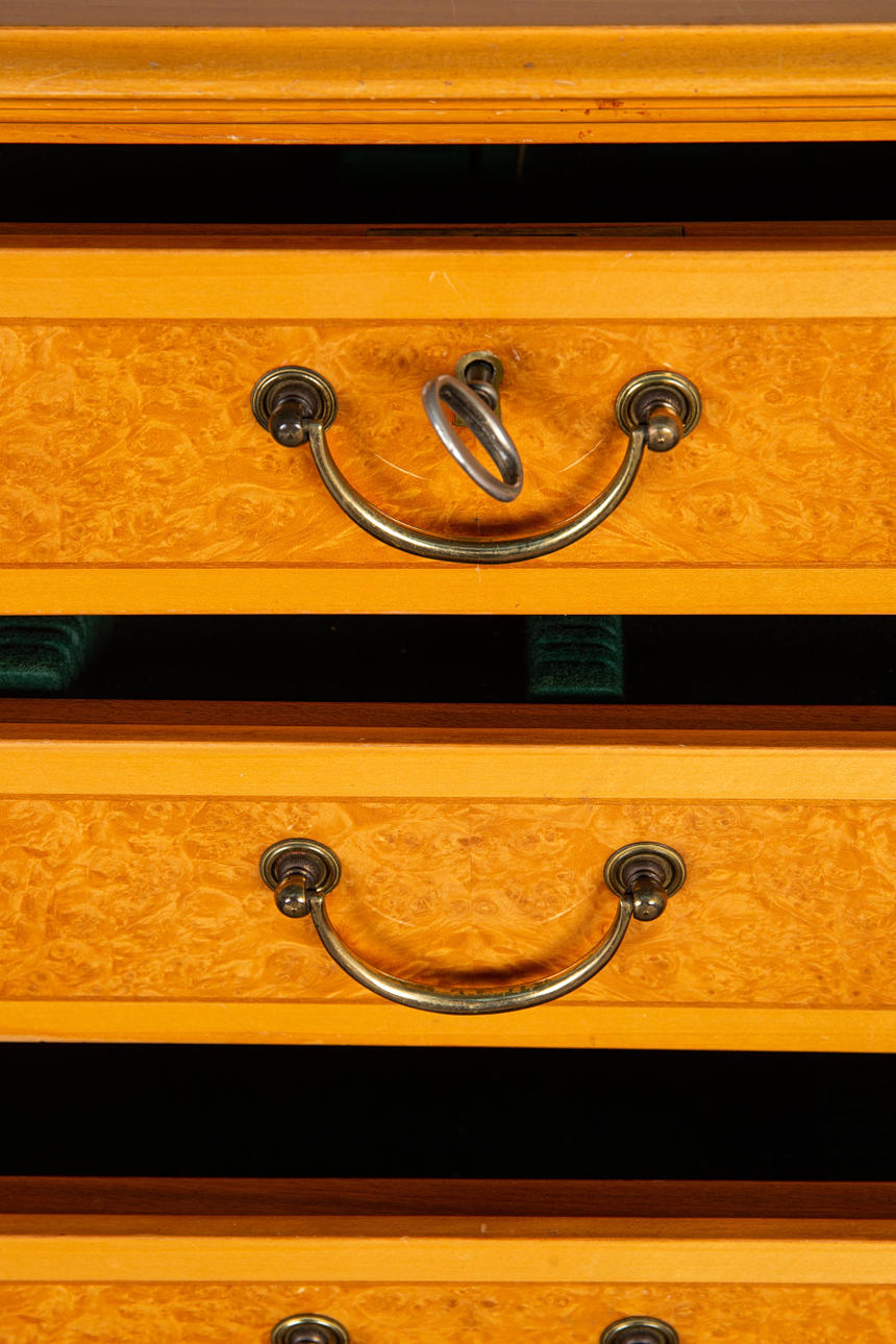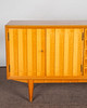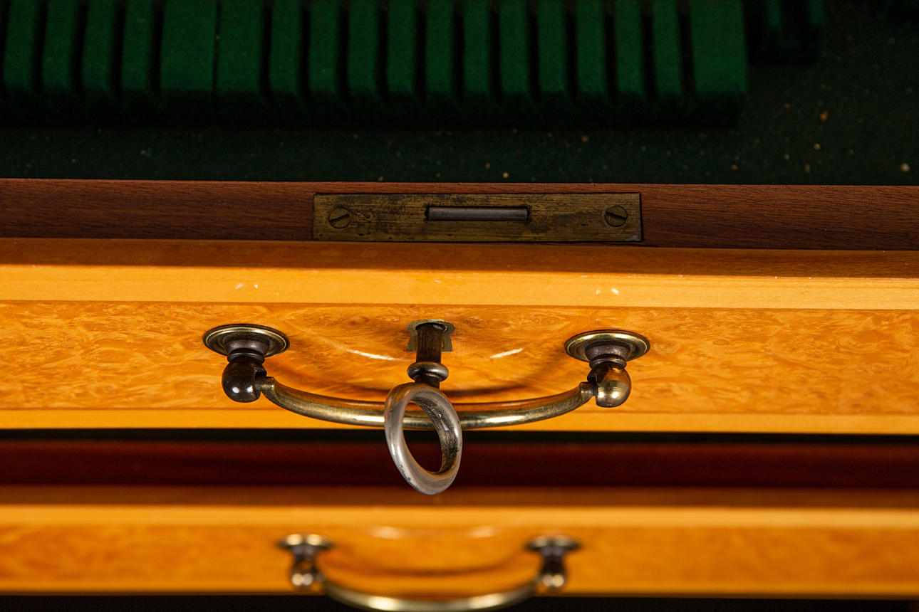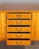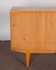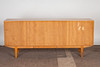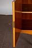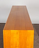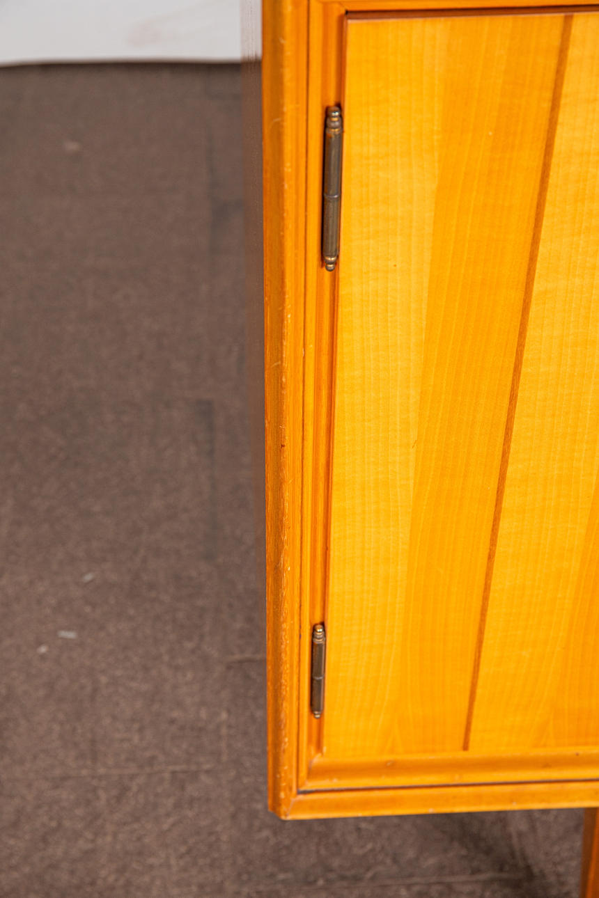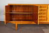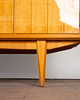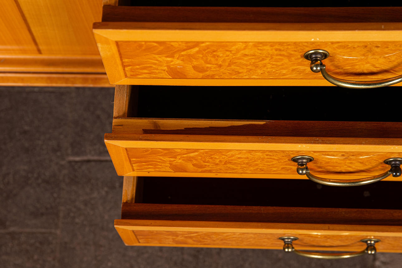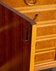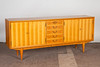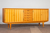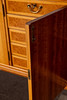 Sideboard, Kirschbaum, Messing, 1950er Jahre. Sideboard mit einem kastenförmigen Korpus aus Kirschbaumholz mit Holzintarsien, rechts und links jeweils mit einer verschließbaren Doppeltür versehen, sowie mittig mit fünf Schüben mit Messinggriffen, oberster Schub verschließbar, zwei Schübe mit grünen Besteckeinlagen versehen, innen mit Einlegeböden ausgestattet, Schlüssel vorhanden, H.93cm, L.220cm, B.48cm.