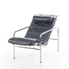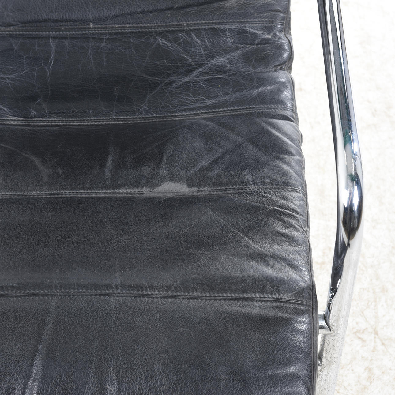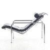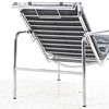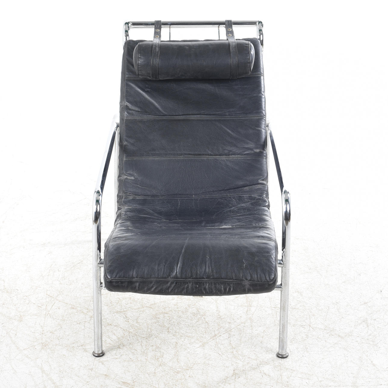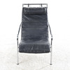 Gestell aus verchromten Stahlrohren, lose aufliegende Kissen und Nackenkissen aus schwarzem Leder. Entworfen 1935. 1980er/90er Jahre, wohl Zanotta, Italien, Höhe ca. 82, Breite ca. 57, Tiefe ca. 105 cm.