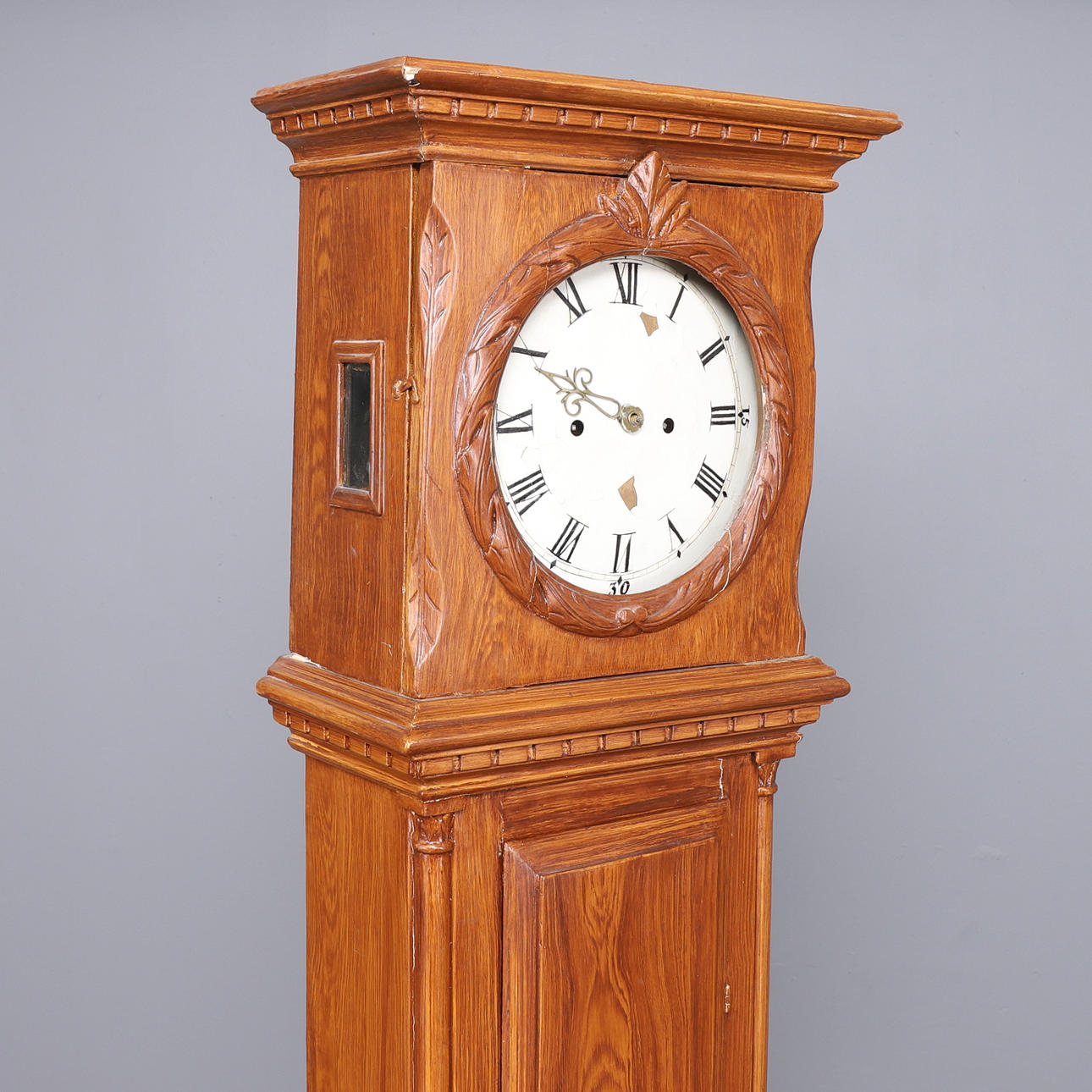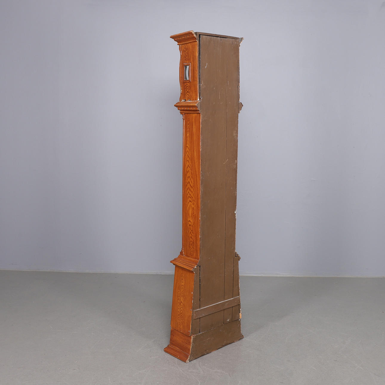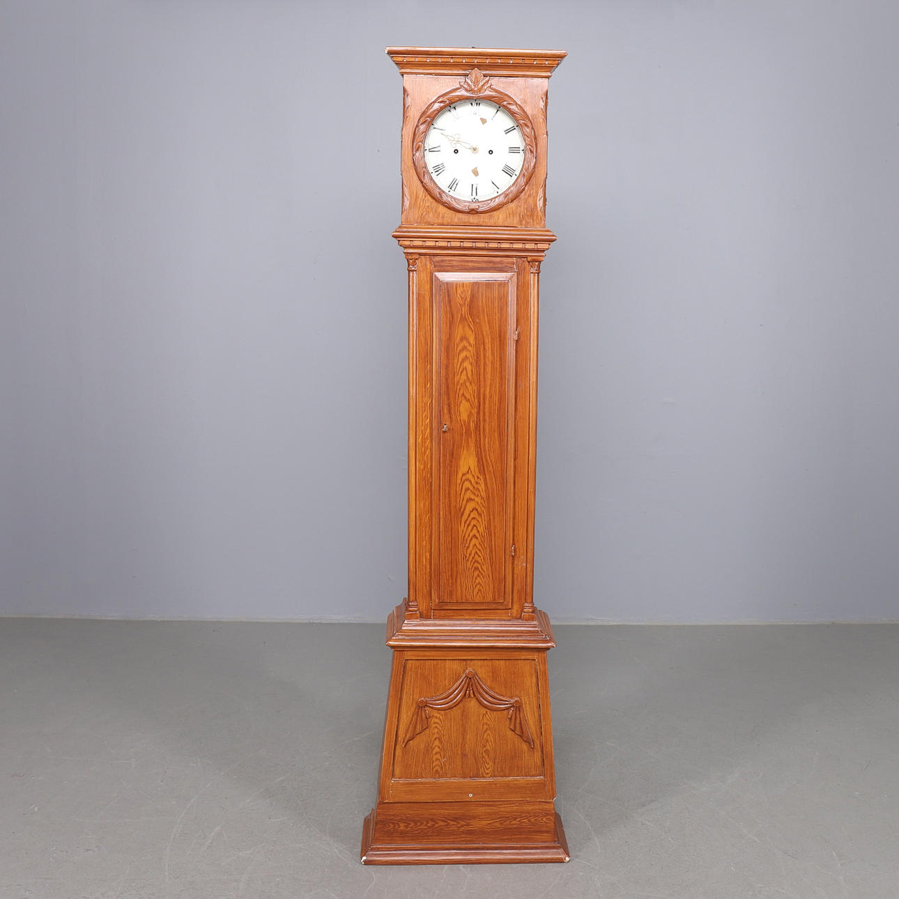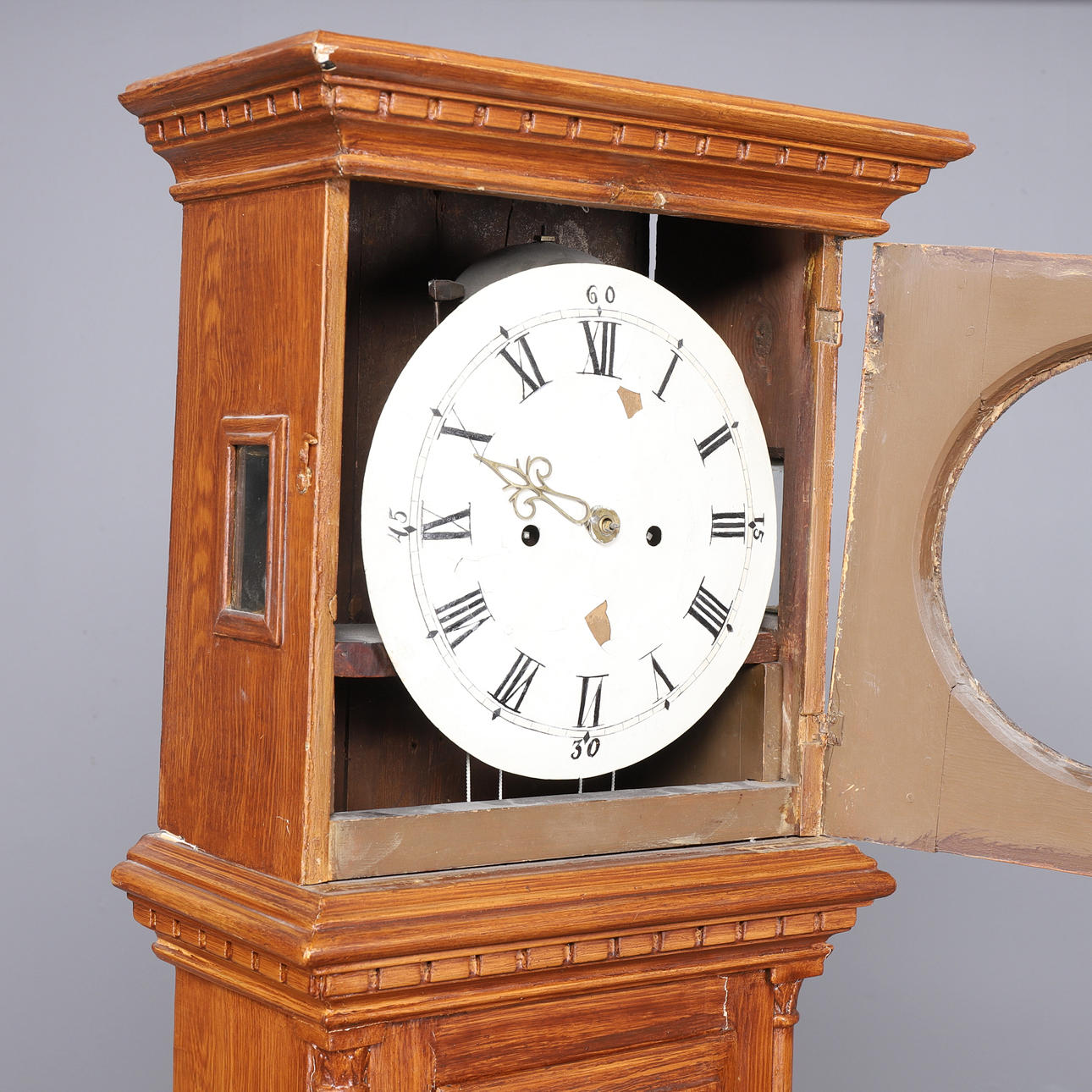 Maserung bemalt, Holzschnitzdekor, inkl. Senklot und Pendel, Höhe ca. 212 cm, Breite 40 cm, Tiefe 25 cm.