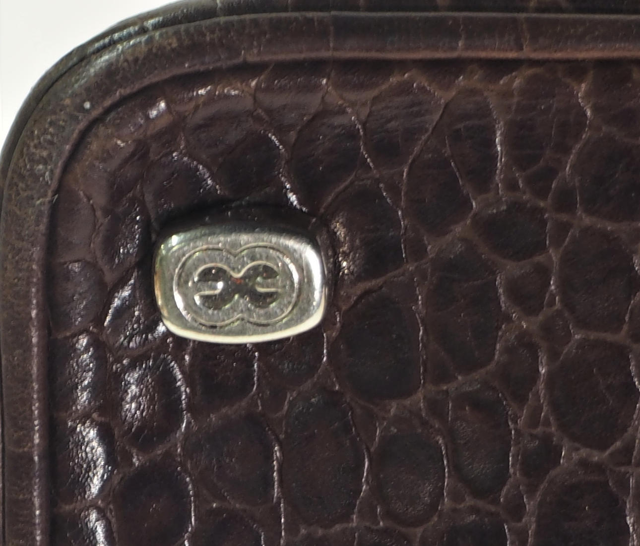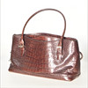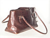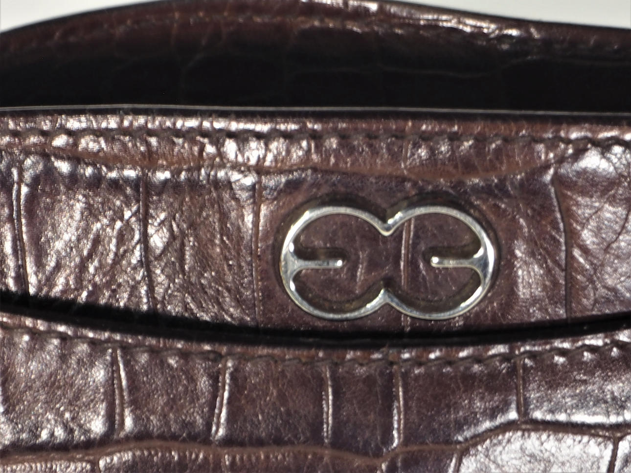 Handtasche aus geprägtem braunem Leder. Gemarkt mit Tablett und Logo auf Metallteilen und Futter. Höhe 18,5 cm, Länge 32 cm, Breite 12 cm.