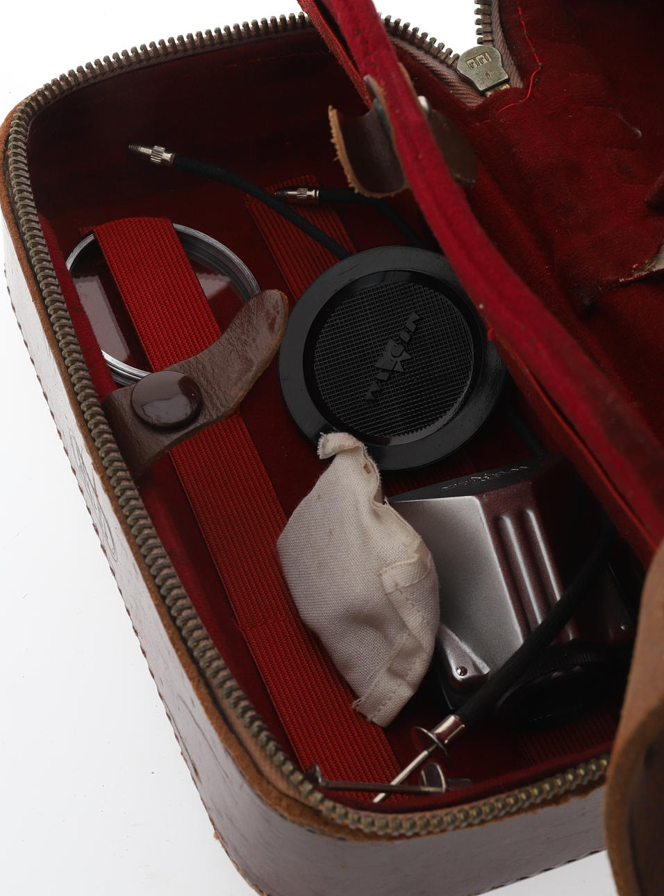 mit Zoomobjektiv, ein Soligor 1:3,5 f=135mm Nr. H670402 Teleauto-Objektiv mit anderem Zubehör in einer braunen Ledertragetasche, einer Kodak Retinette IB-Kamera, einer weiteren Kodak Retinette-Kamera und einem Helles Paris 10x35 Fernglas, alles in einer braunen Ledertragetasche (Menge).