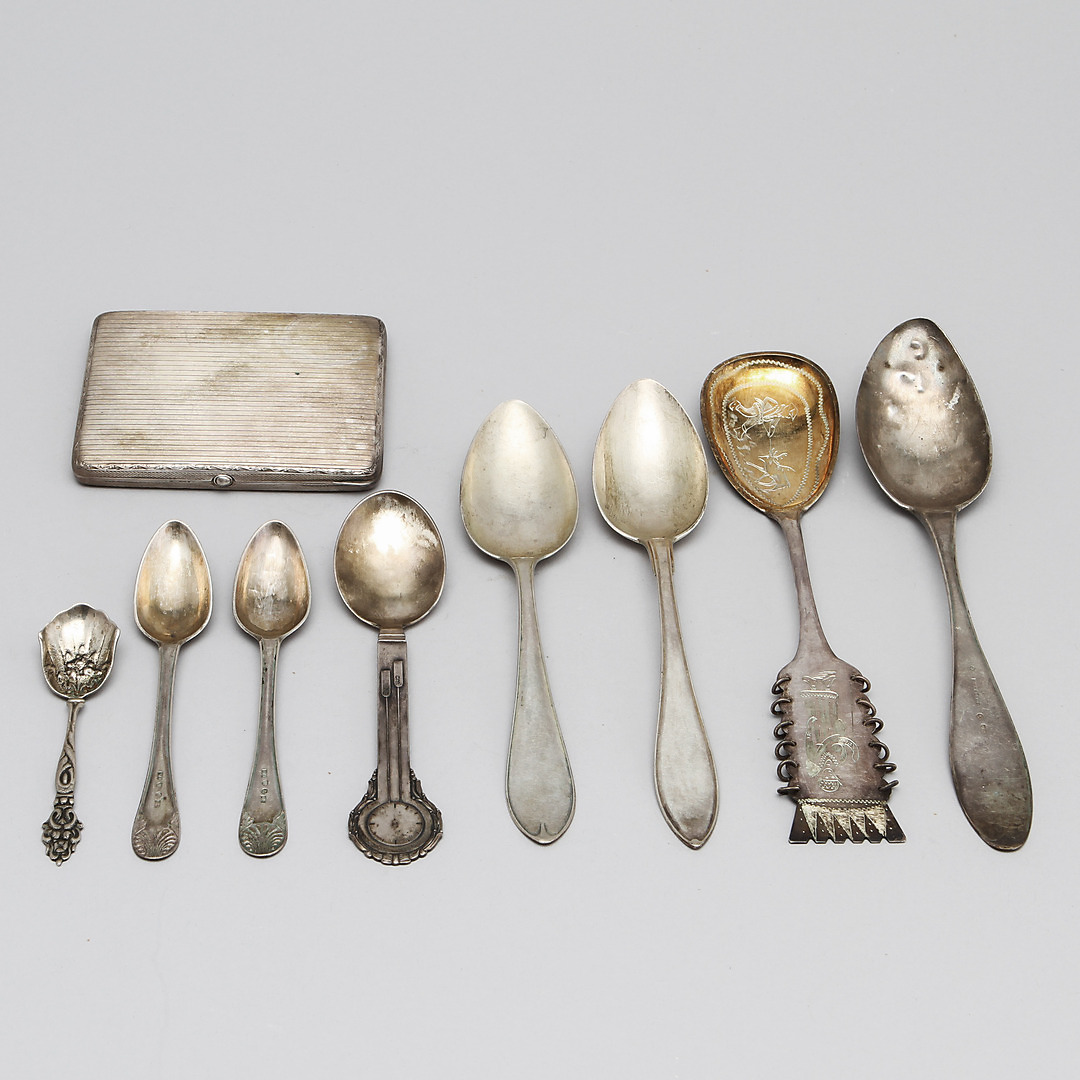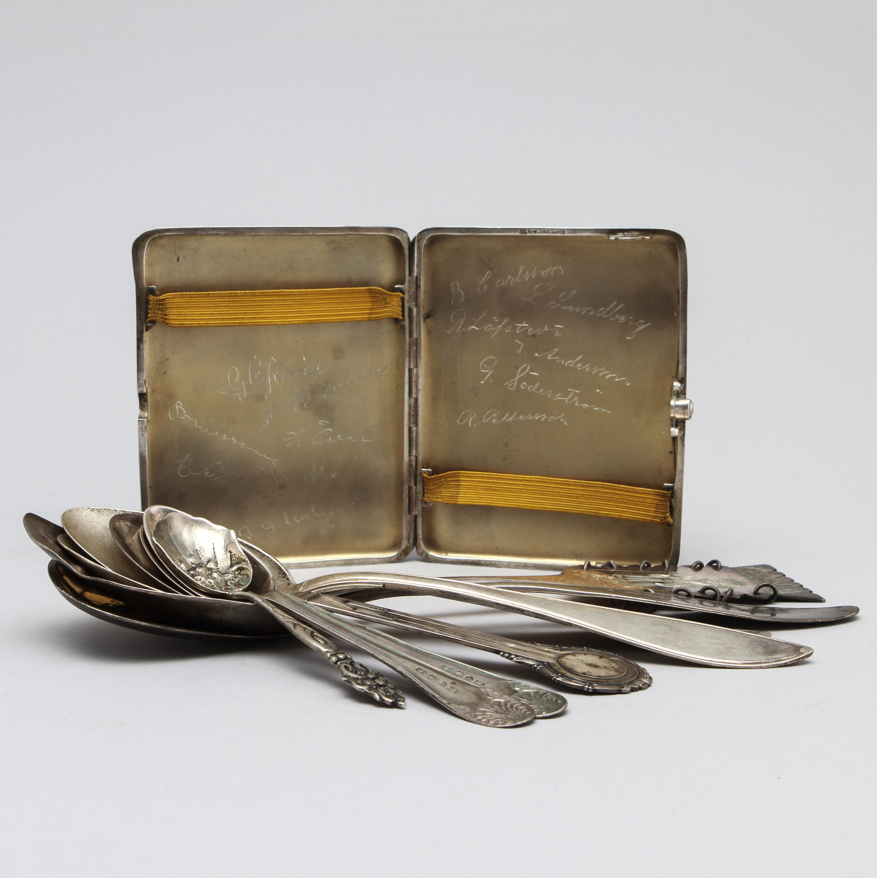 176458. SILBERARTIKEL, Zigarettenetui und Löffel, 381g.