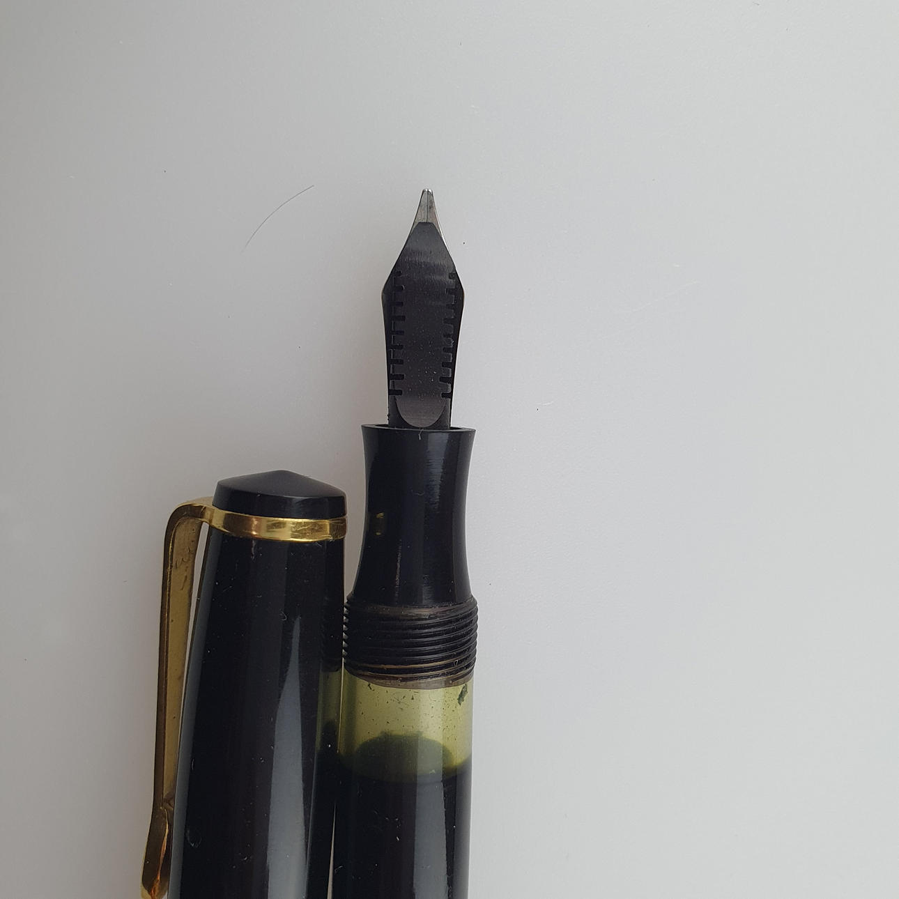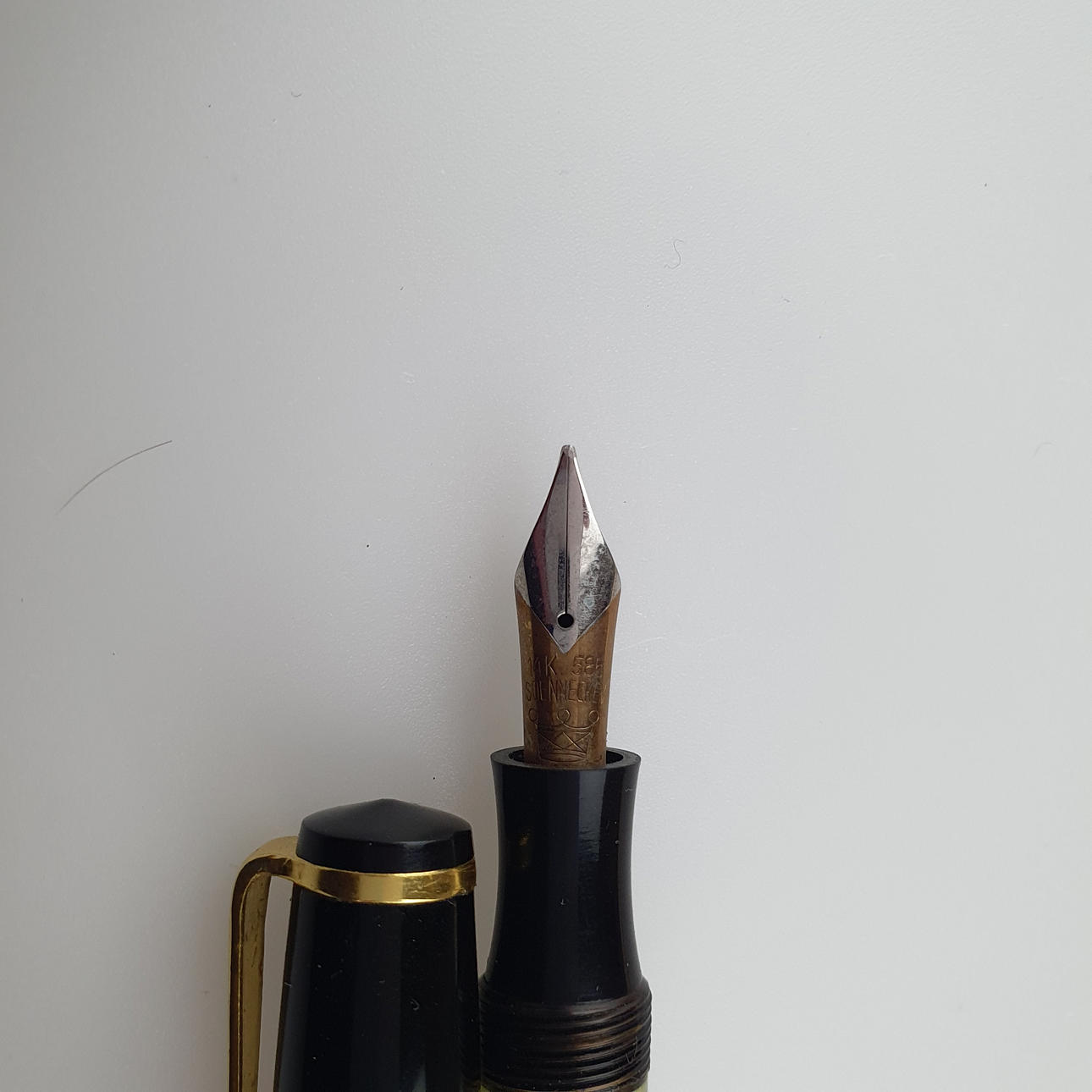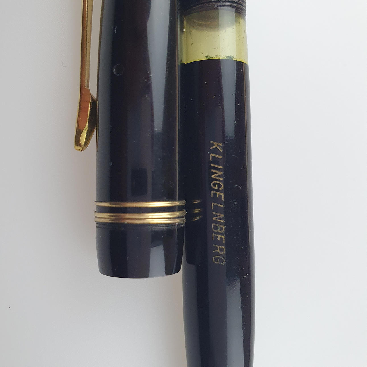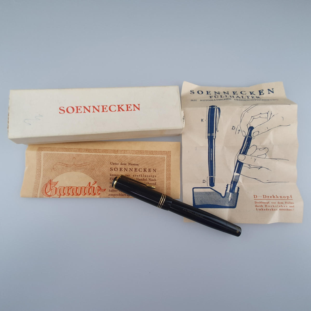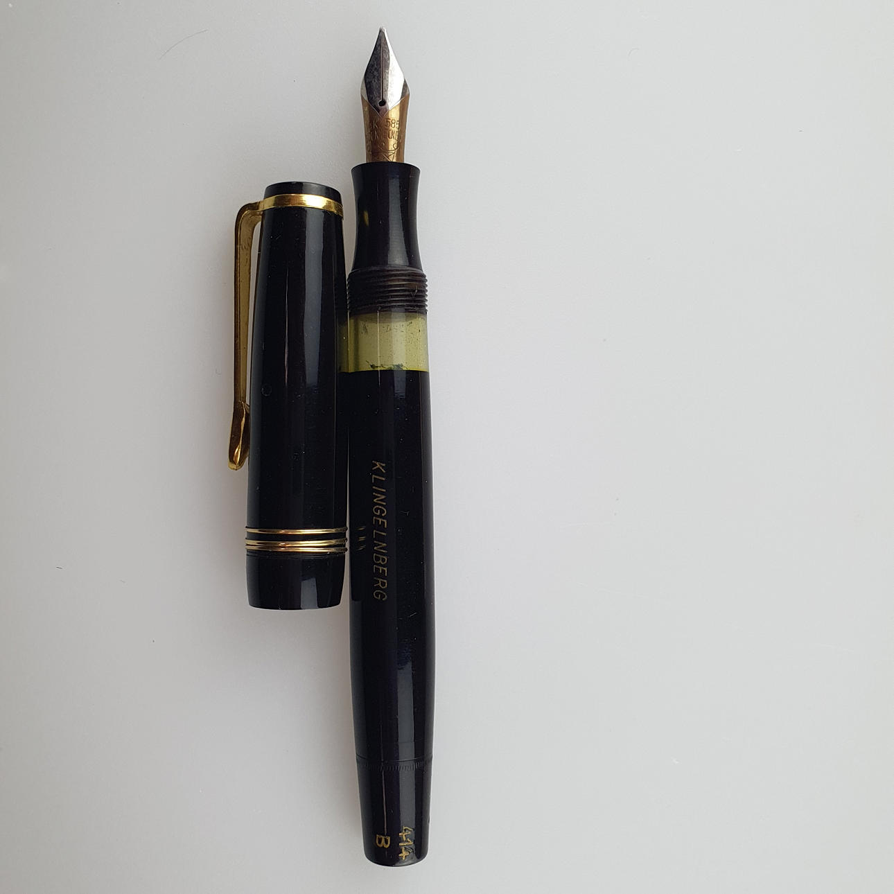 Füllhalter mit automatischer Drehkopfsicherung, 585er GG-Feder gestempelt "14K 585 Soennecken", Verschlusskappe gemarkt "Soennecken", Füllhalter graviert "Klingelnberg", L.ca.12,5cm.