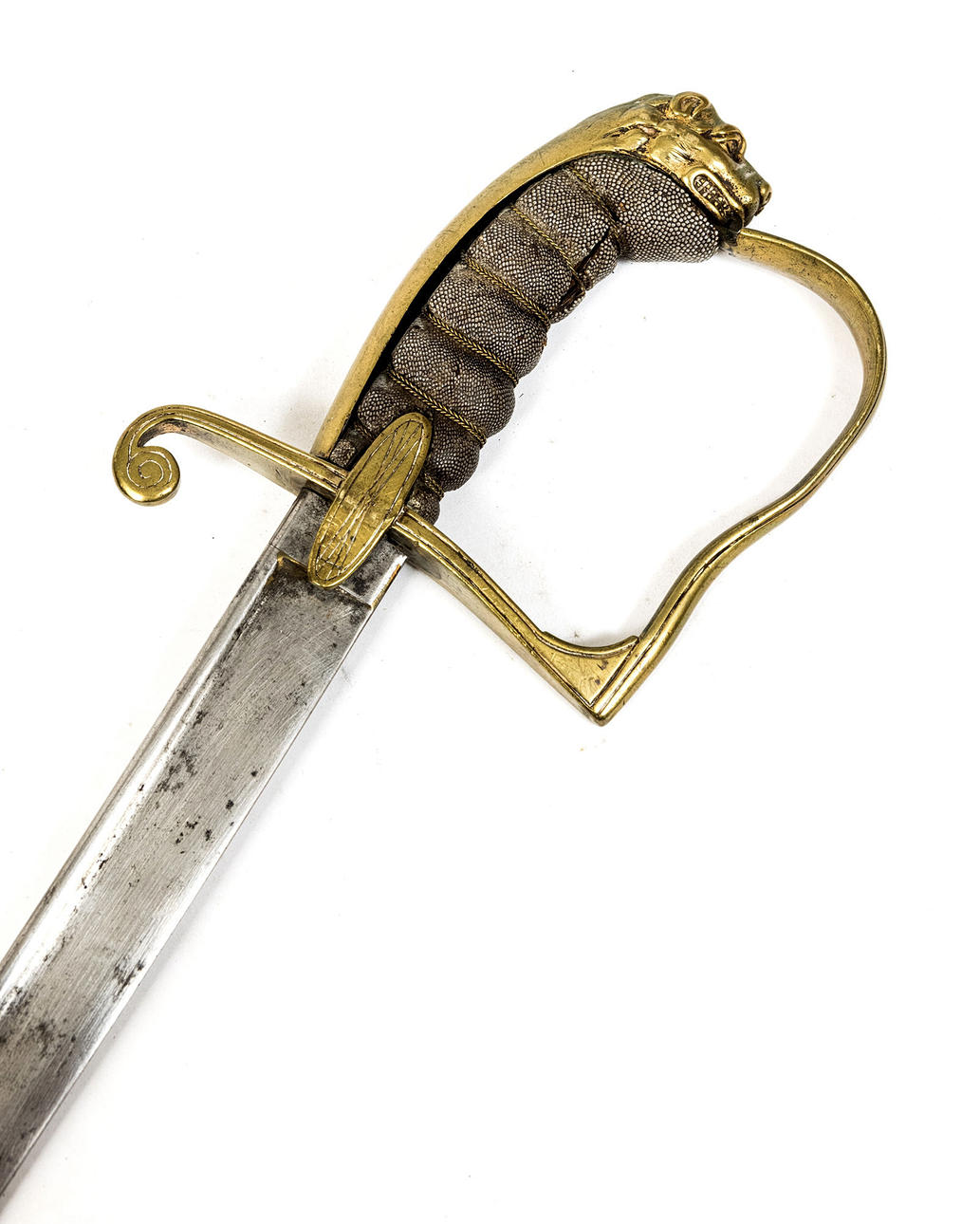Messingmontierung mit Löwenkappe, Spule mit Metallwicklung, leicht gebogene Rückenklinge mit abgerundetem Rücken, Länge ca. 87 cm, Klingenlänge ca. 75 cm, Messingwanne mit zwei Leinenringen.