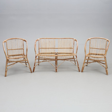 Zweisitziges Sofa und zwei passende Elementsessel. Gepolsterte, schwere Holzrahmenkonstruktion mit abgesteppten Bezügen aus dunkelrotem Leder, das Sofa zweiteilig konstruiert. Sofa und Einzelsessel mit niedrigen Füßen aus verchromtem Metall. Maße ca. Sofa: H. 66 cm, B. 260 cm, T. 100 cm Sofa: H. 66 cm, B. 80 cm, T. 100 cm.