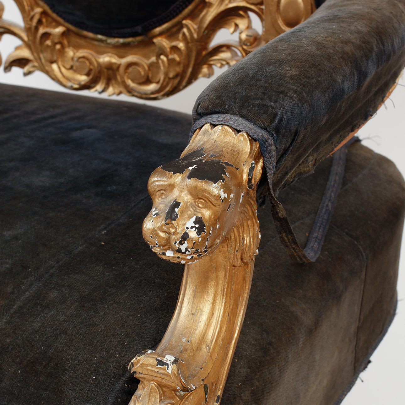 Schnittdekor aus ua Blumen, Akanthusblättern und Schilden, Armreif mit Löwenmakronendekor. Länge ca. 183 cm, Tiefe ca. 66 cm, Sitzhöhe ca. 40 cm, Gesamthöhe ca. 120 cm.