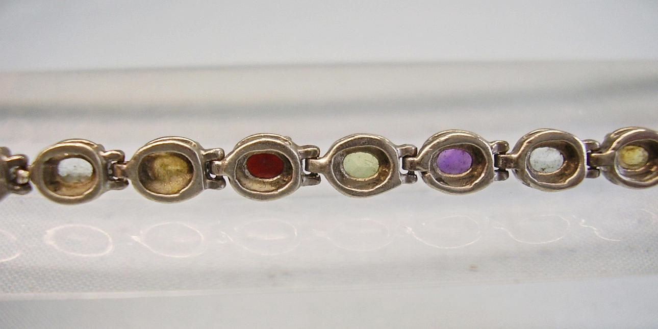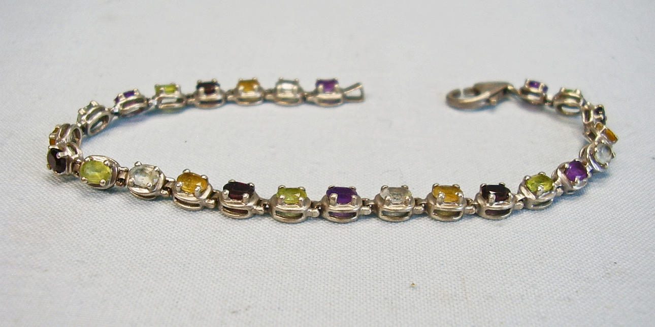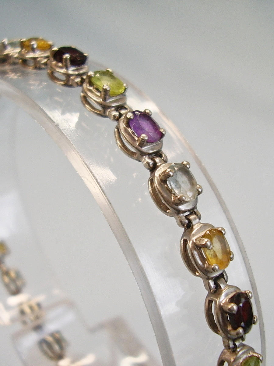 Es ist besetzt mit oval facettierten, natürlichen Edelsteinen wie Amethyst, Peridot, Citrin, Blautopas, u. Granat von zus. ca. 4.4 ct.,