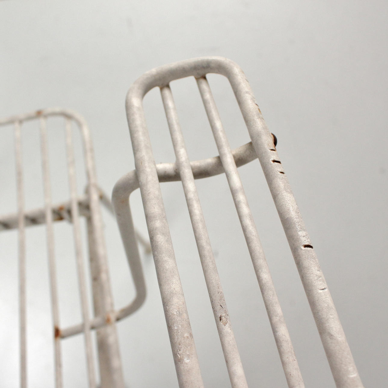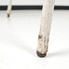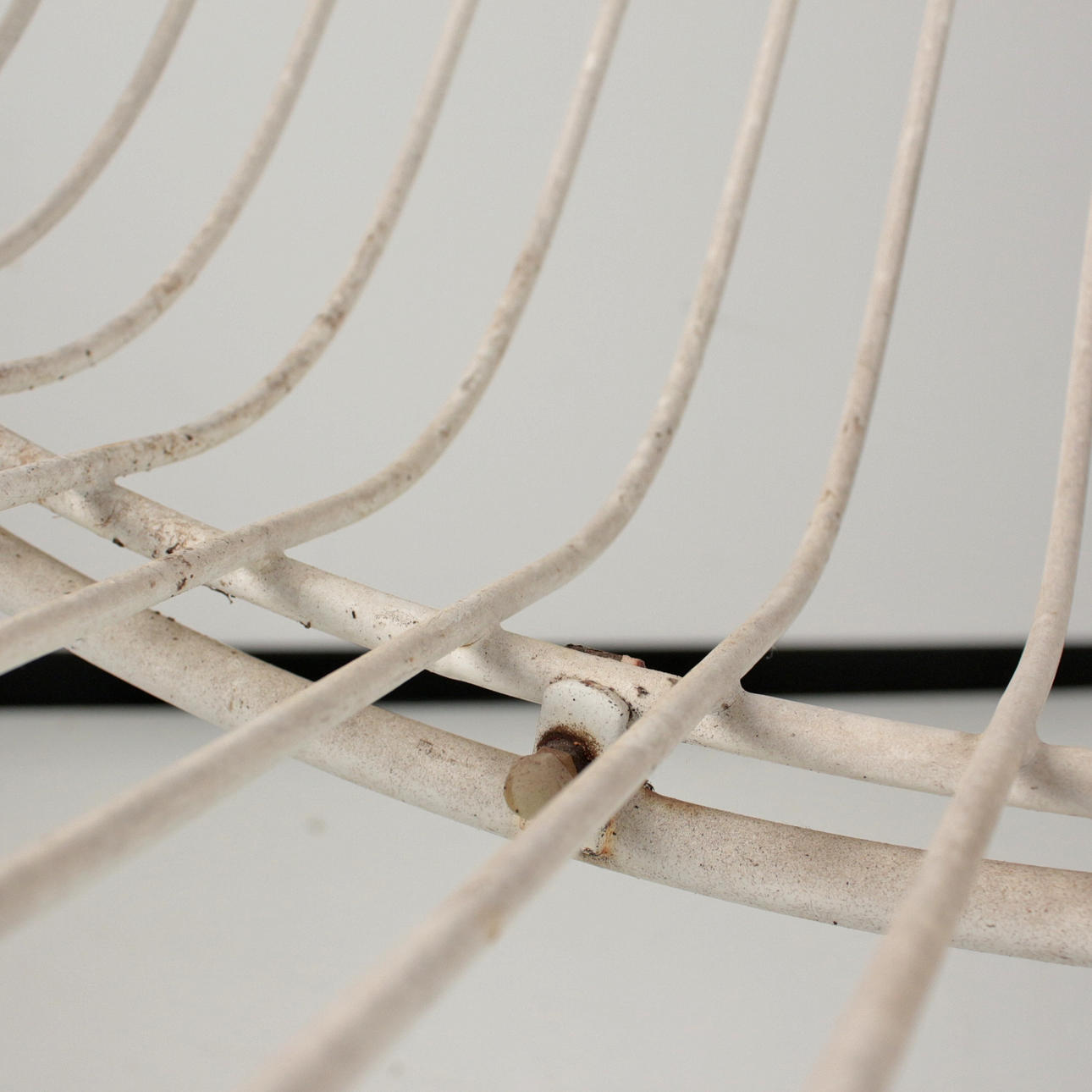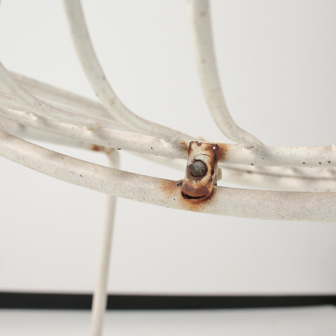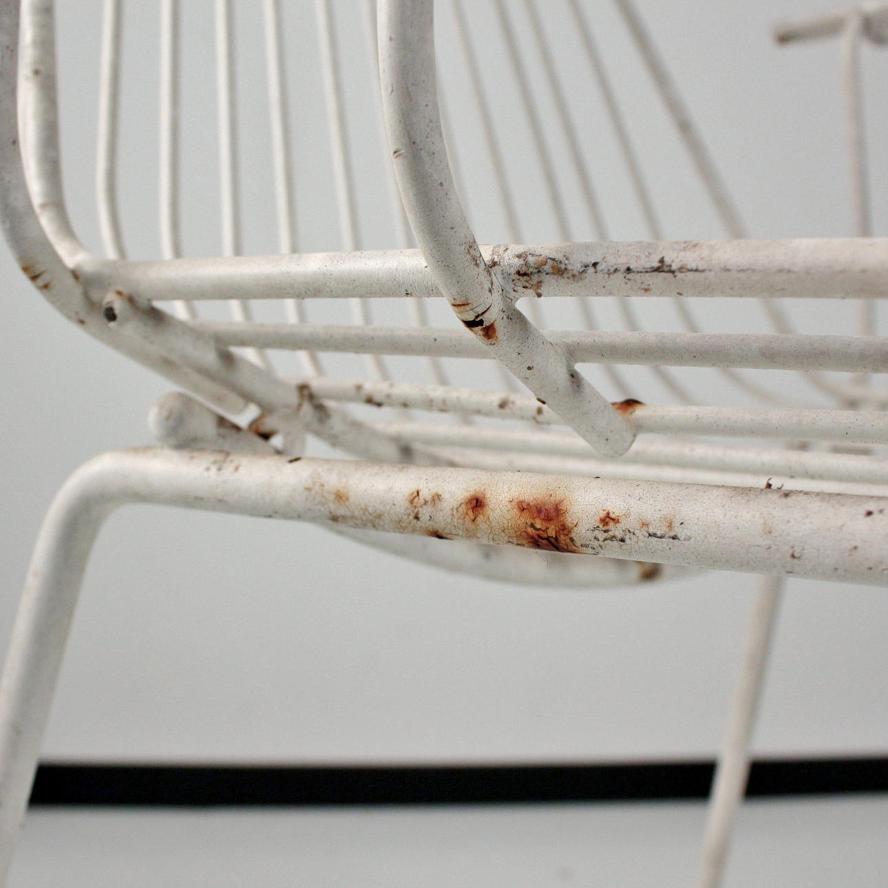 Deutliche, witterungsbedingte Gebrauchsspuren, die weiße Beschichtung ist stark vergraut, verschmutzt und weist zahlreiche kleine Fehlstellen, Kratzer und Bestoßungen auf, an diesen Stellen mit punktuellem Rostbefall, die Fußstopfen sind durchgescheuert und haben keine Dämpfungswirkung mehr.