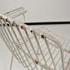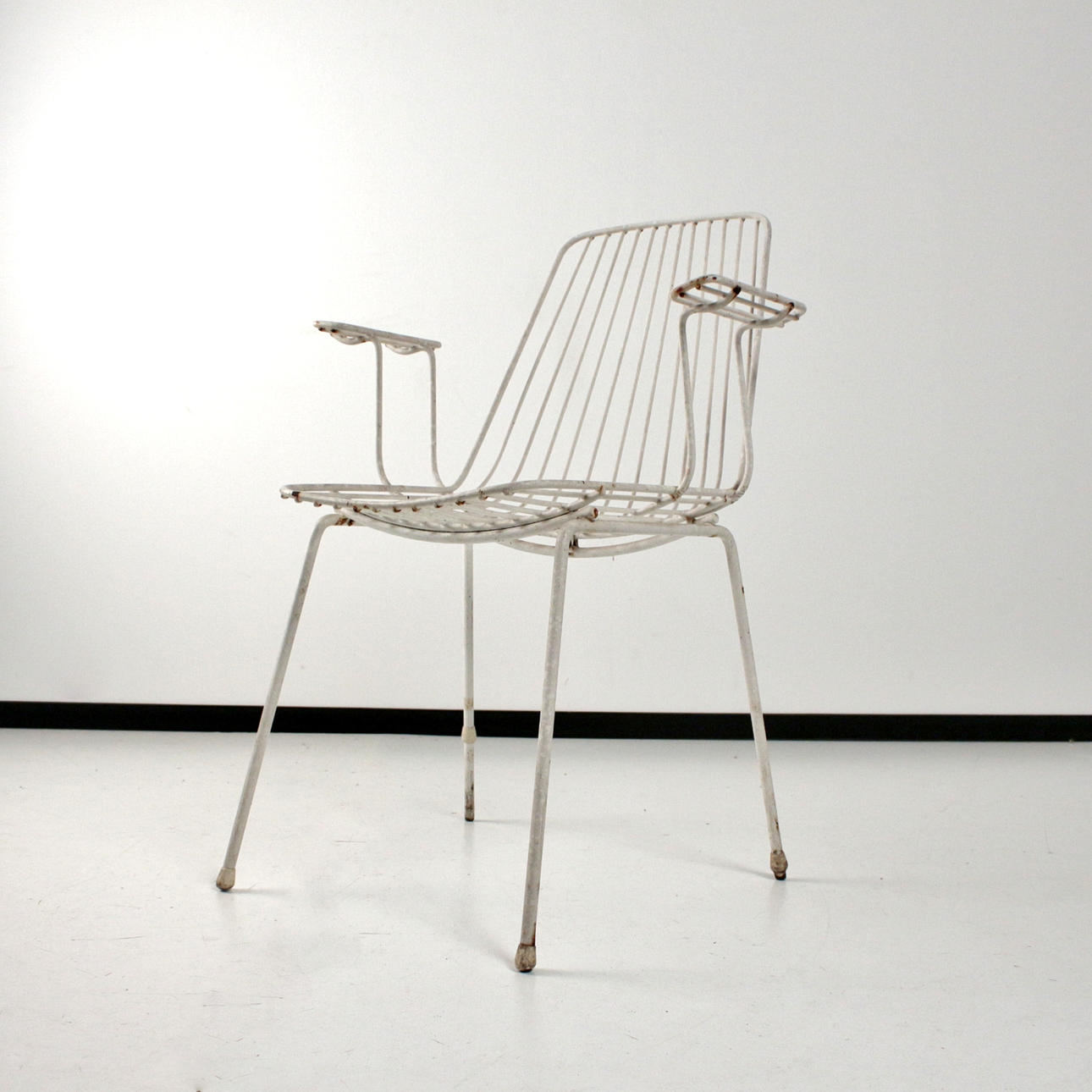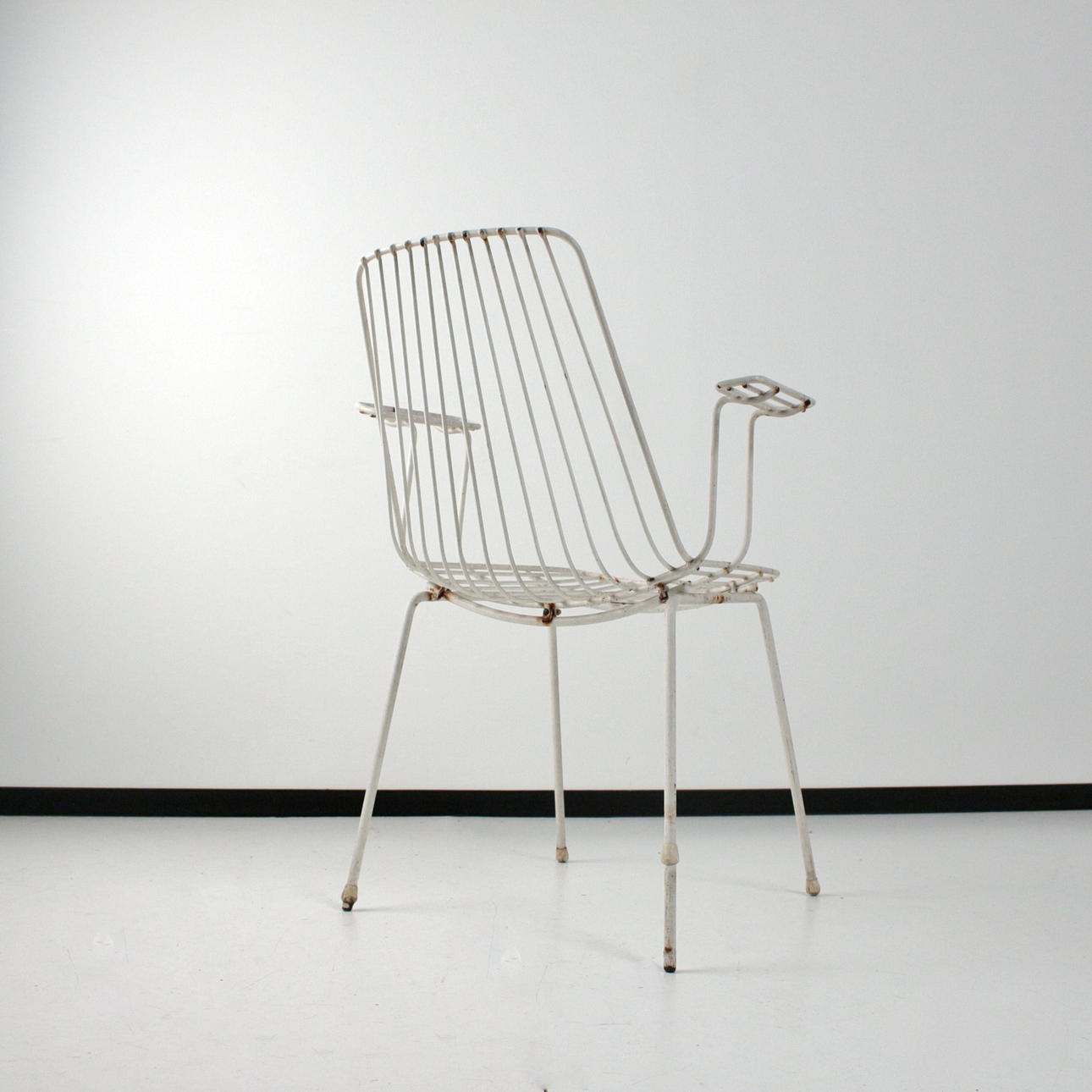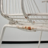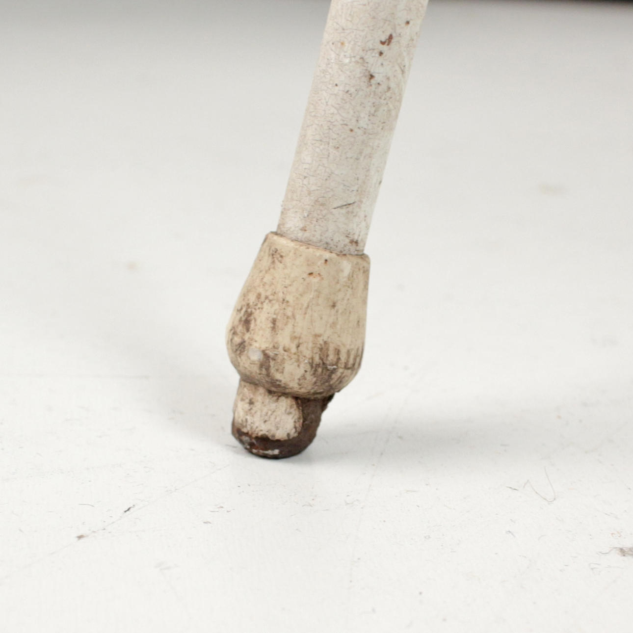 Deutliche, witterungsbedingte Gebrauchsspuren, die weiße Beschichtung ist stark vergraut, verschmutzt und weist zahlreiche kleine Fehlstellen, Kratzer und Bestoßungen auf, an diesen Stellen mit punktuellem Rostbefall, die Fußstopfen sind durchgescheuert und haben keine Dämpfungswirkung mehr.