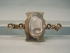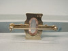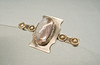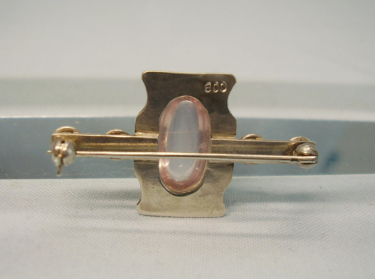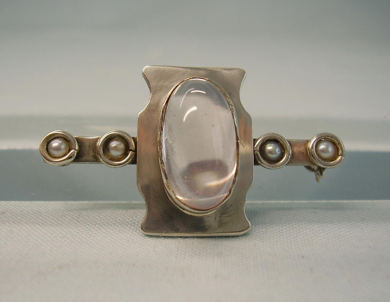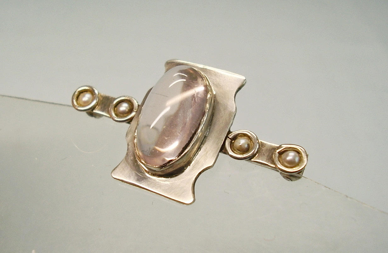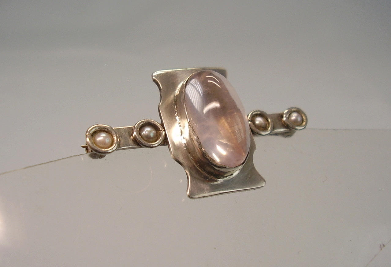 Sie ist mit einem ovalen Rosenquarz-Cabochon besetzt. An beiden Seiten sind grau-weiße Flußperlen eingefasst. Auf der Rückseite ist eine lange Nadel mit Sicherheitsverschluss angebracht.