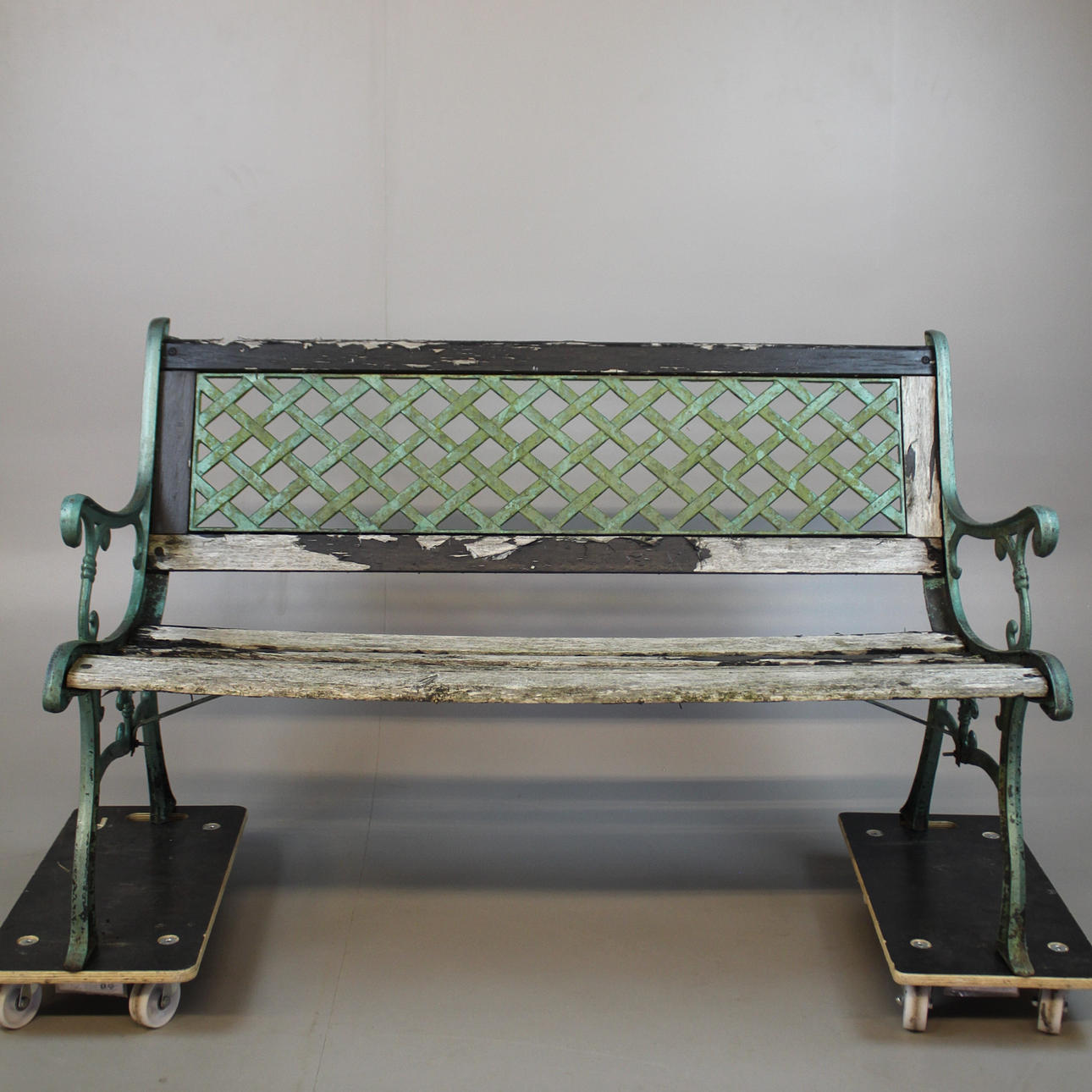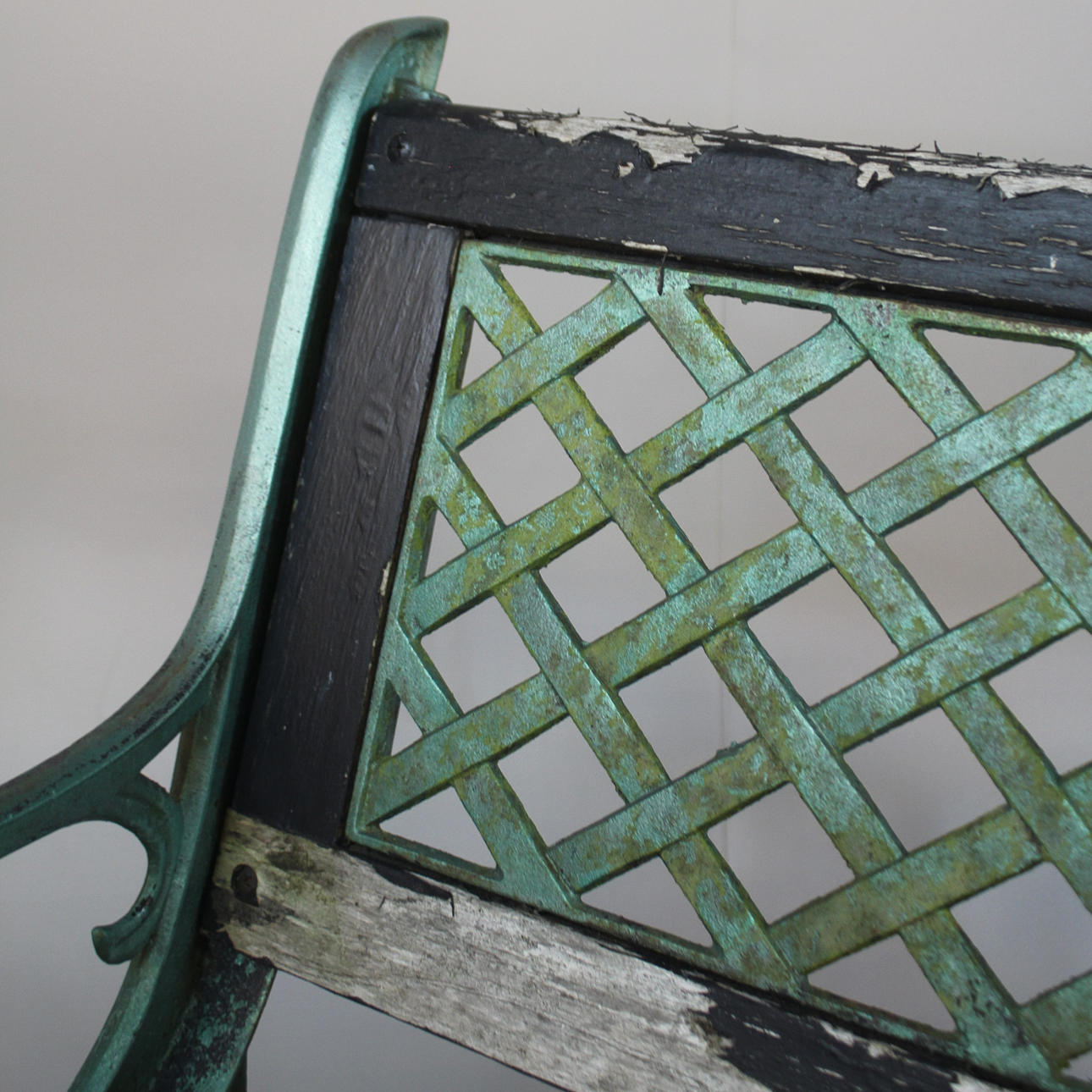 Gebrauchs- und Witterungsverschleiß, Holzlatten tragen, Farbe blättert ab.