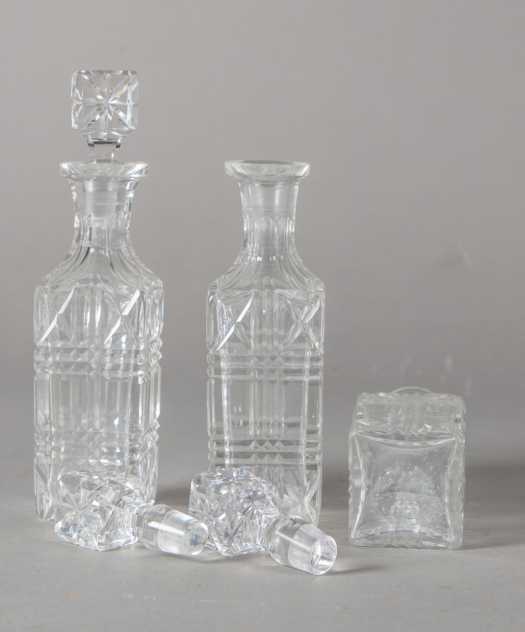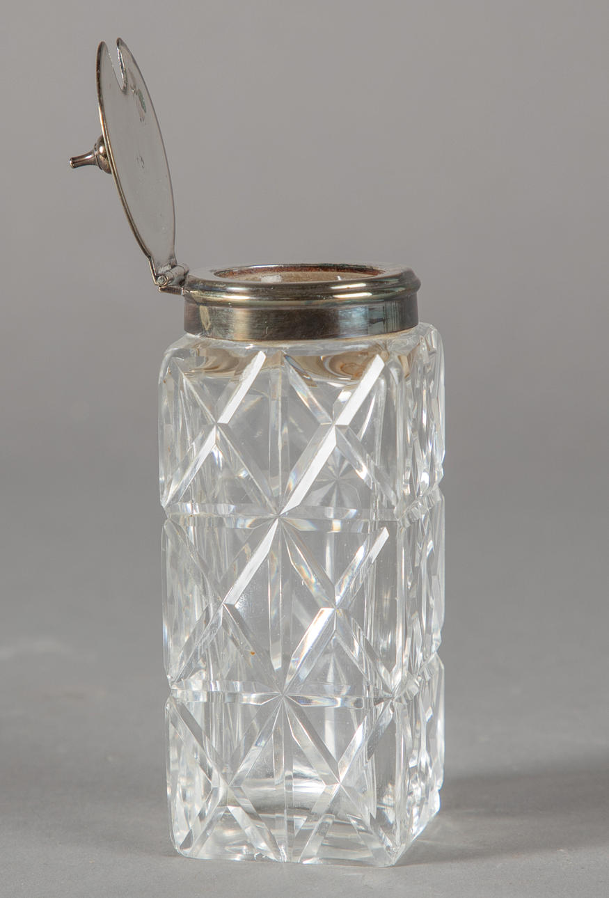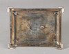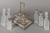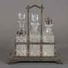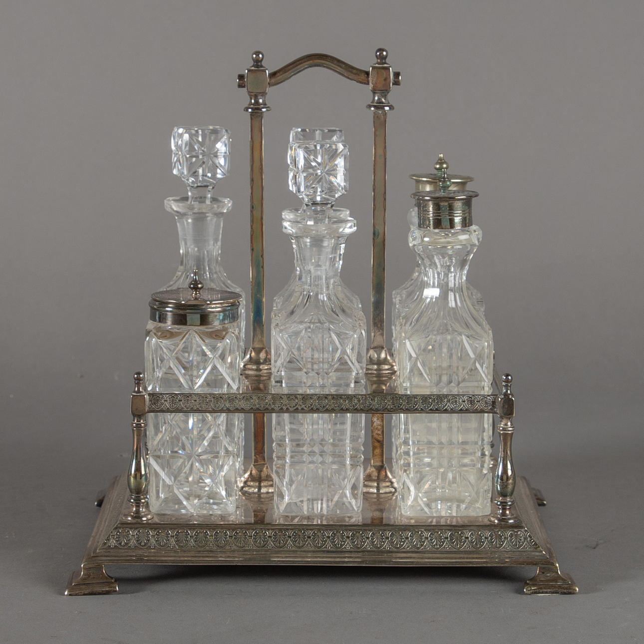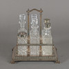 Metall, versilbert. Rechteckige Plinthe mit schräg aufsteigendem Rand auf Dreieck-Füßen. Sechspassiges Gitter auf Balusterstreben, bzw. Griff auf Vierkantstreben. Umlaufender Anthemionfries im Relief auf den Rändern. 6-teilige Gewürzgarnitur aus Kristallglas mit Steinschliff und tlw. versilberten Metallmontagen. U.a. 1 Salz- u. Pfefferstreuer, 3 Karaffen und 1 Senftopf. HxBxT: 25,5 x 24 x 19 cm. Gestempelt "EPNS und Herstellersignet.