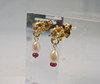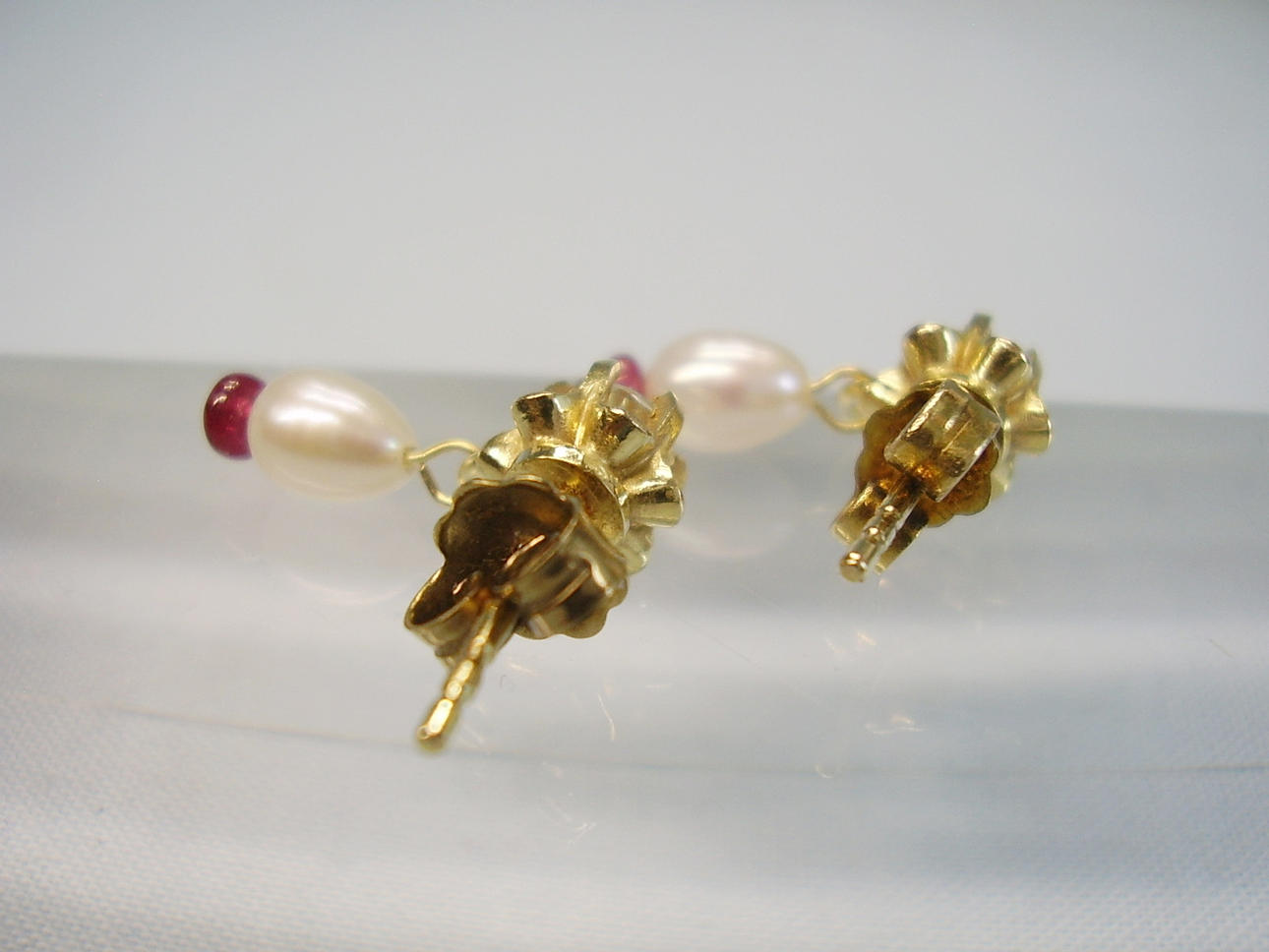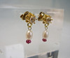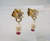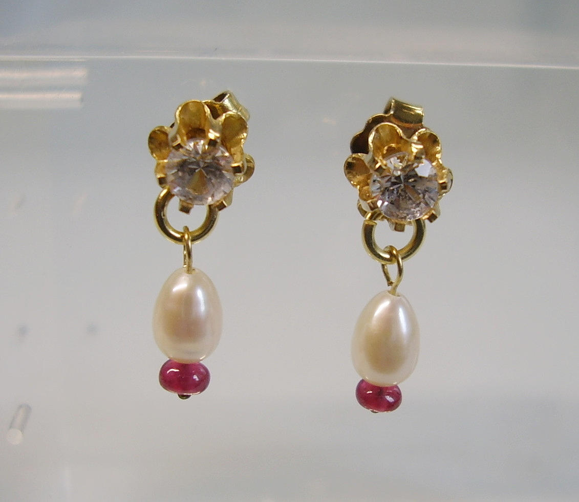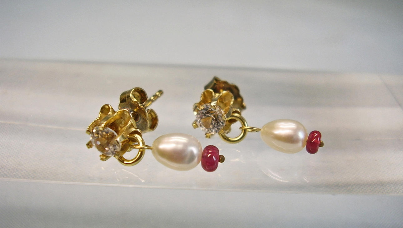 Sie sind mit rund facettierten, weißen Saphiren besetzt, die als unteren Abschluss kleine weiße Flußperlen und Rubine tragen.