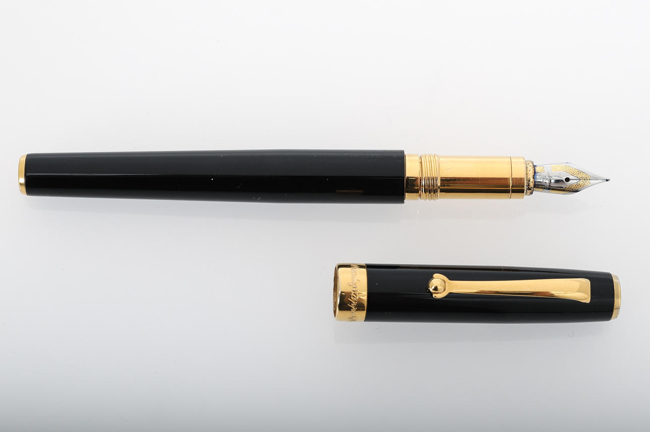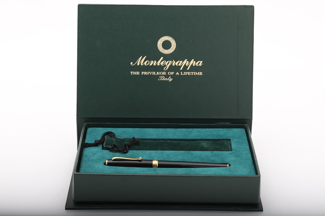 Montegrappa, Füllfederhalter, Etui in schwarzem Lack, Details in doppelter, zweifarbiger Feder, Länge ca. 140 mm, Box mit Innenausstattung und Original-Staubbeutel inklusive.