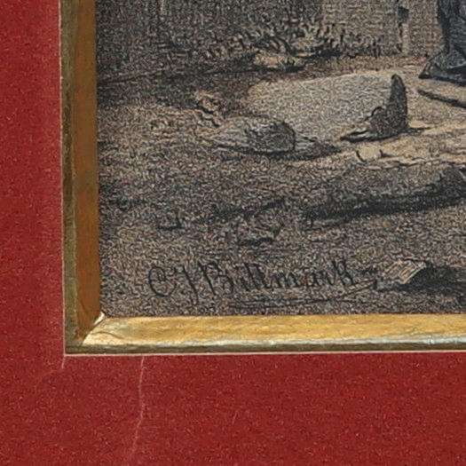 Holprige Väter, rückseitig mit Feuchtflecken, nicht aus dem Rahmen begutachtet.