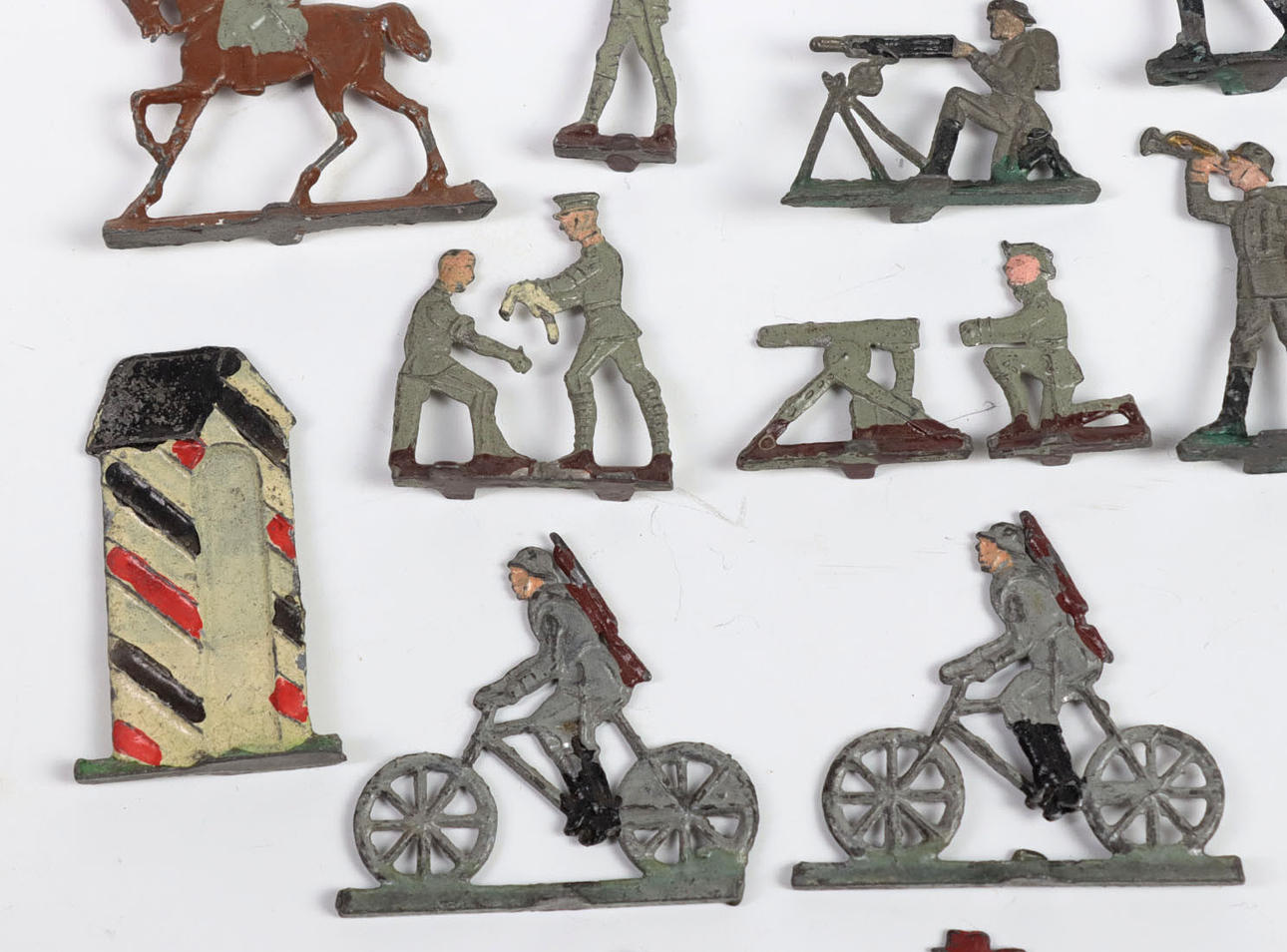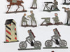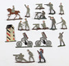 kleine Flachfiguren farbig gefasst, Posten von 17 ausgeführten Soldaten, teils zu Pferd und zu Fahrrad, teils mit Technik H ca. 1,5 bis 4 cm.