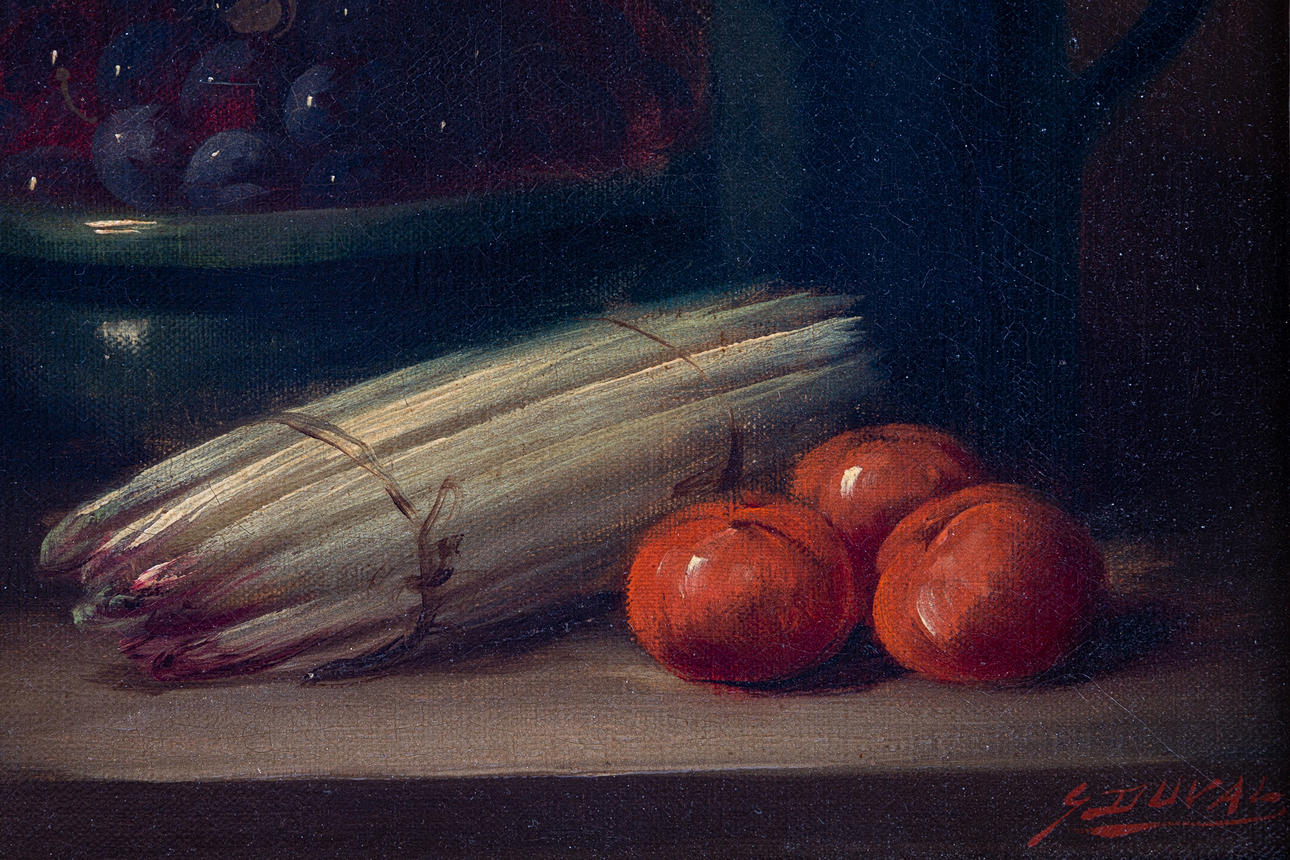 S. Duval, Gemälde, Stillleben mit Spargel, Öl auf Leinwand. Darstellung eines Stilllebens mit Spargel, Trauben und einem Krug auf einem Tisch vor braunem Grund, unten rechts signiert, 23x29cm (43,5x51cm).