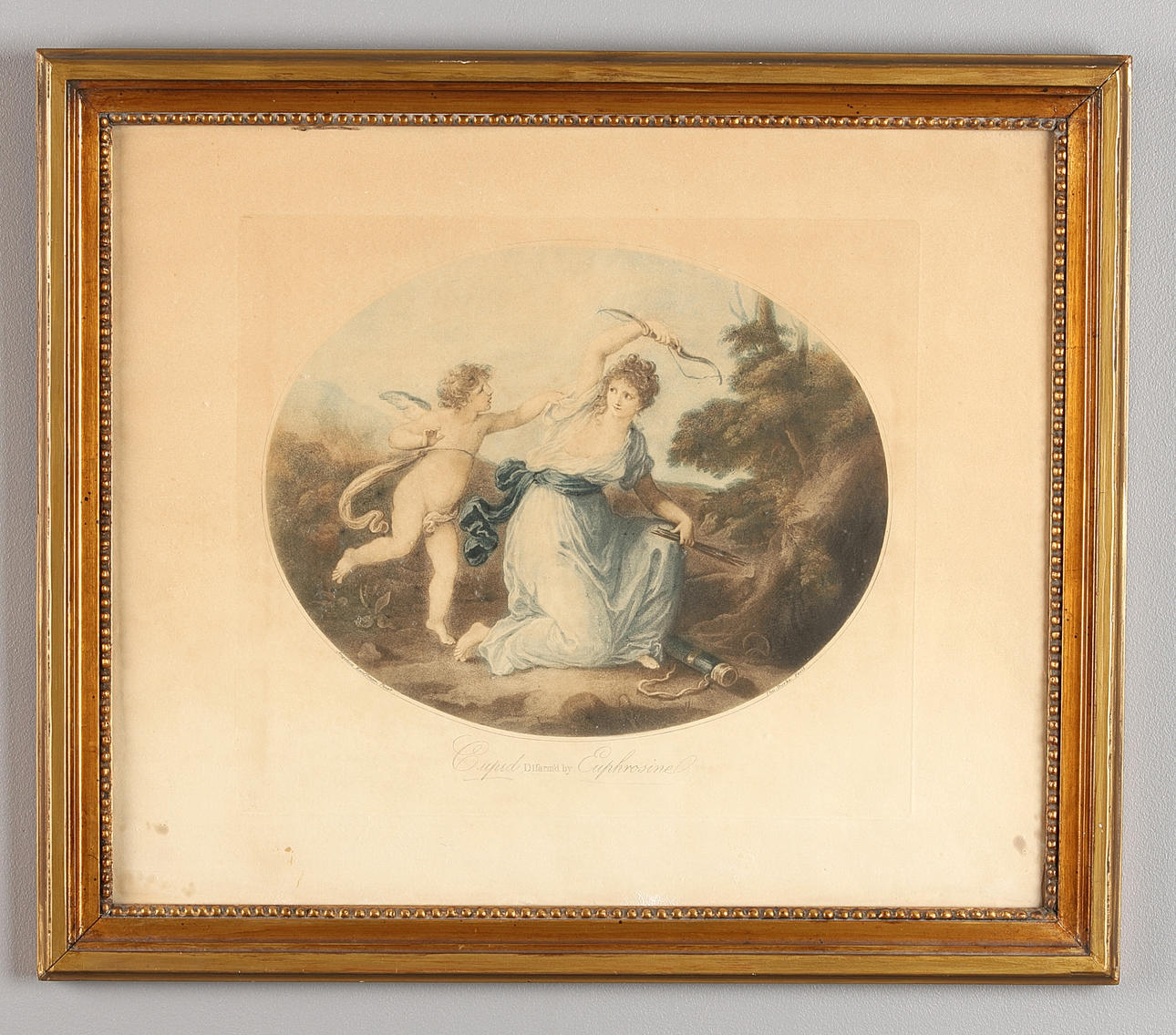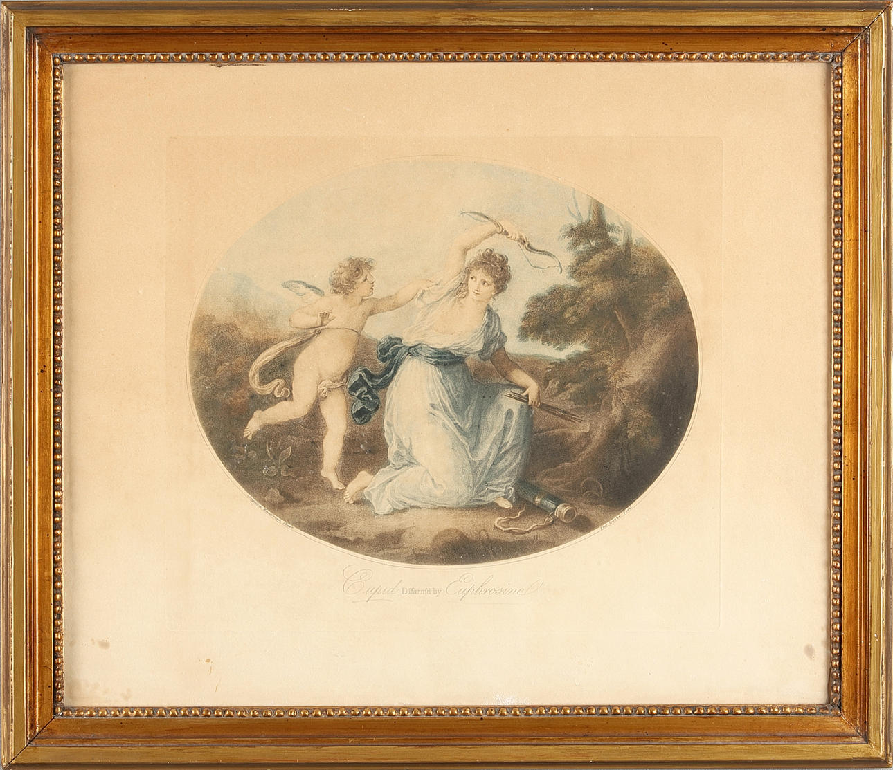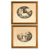 "Amor bindet Aglaia an einen Lorbeer" sowie "Cupid Difarm'd by Euphrosine". Rahmengröße ca. 45x52,5 cm.