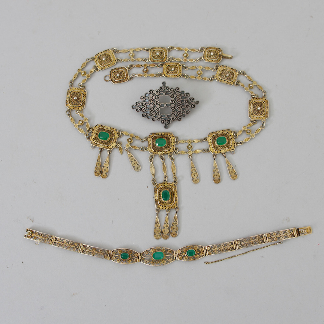 180656. HALSKETTE, ARMBAND UND BROSCHE, Silber mit Steinen.