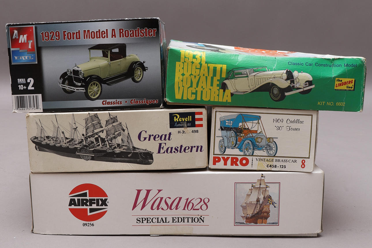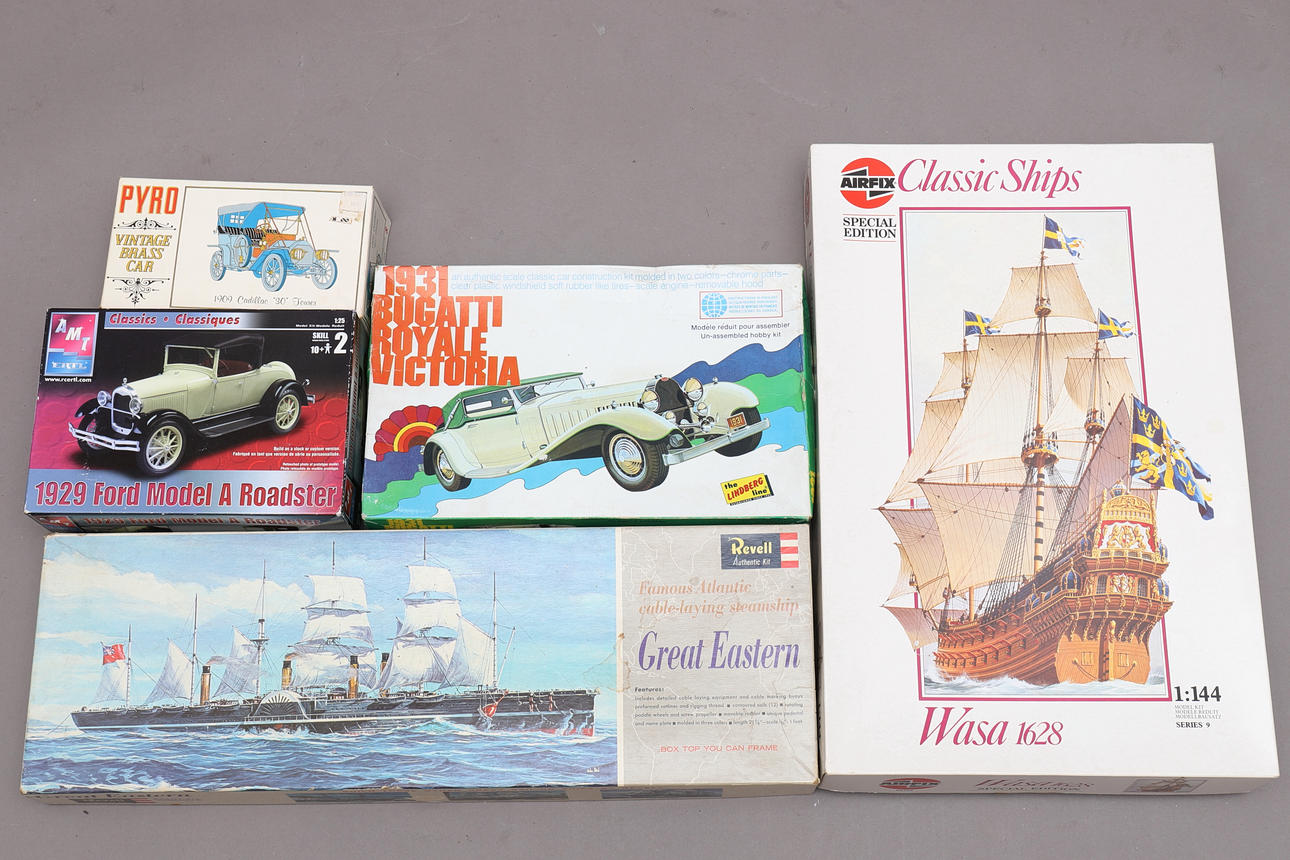 Revell, Great Eastern, 1:32 The Lindberg Line, 1931 Bugatti Royale Victoria, 1:24 Pyro, Vintage Brass Car 1909 Cadillac Tourer, 1:32 Ertl, 1929 Ford Model A Roadster, 1:25 Airfix, Classic Ships Wasa 1628, 1:144.