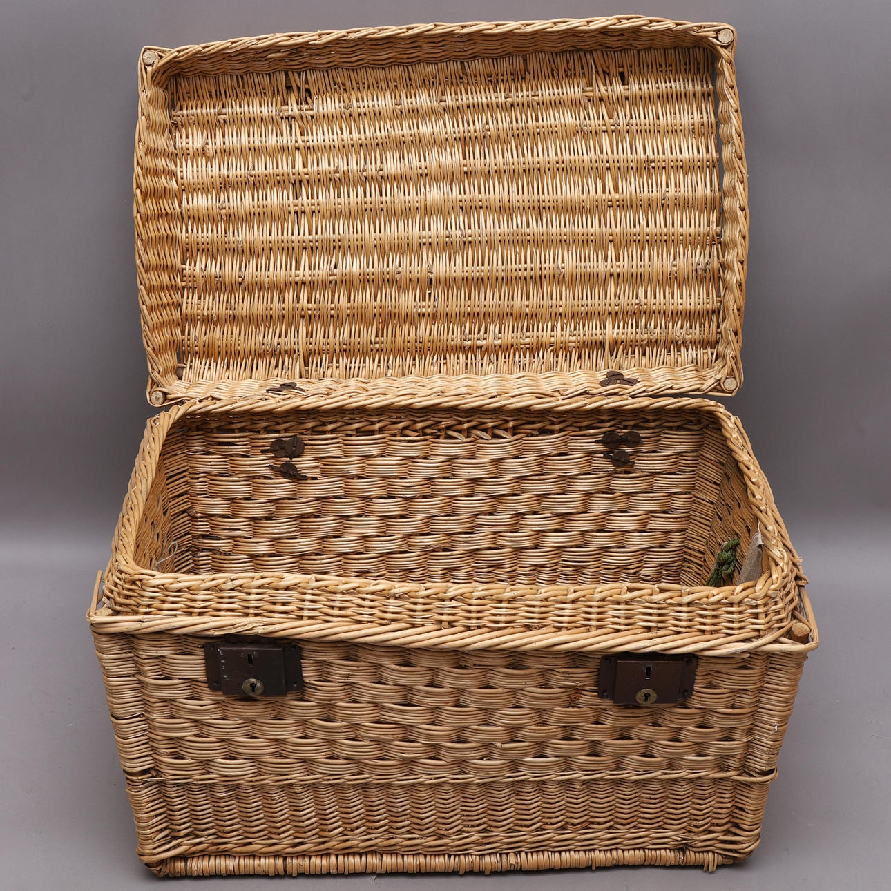 Schloss funktioniert nicht, Teile fehlen. Ansonsten einige Verschleiß mit gebrochenen Rattanzweigen.