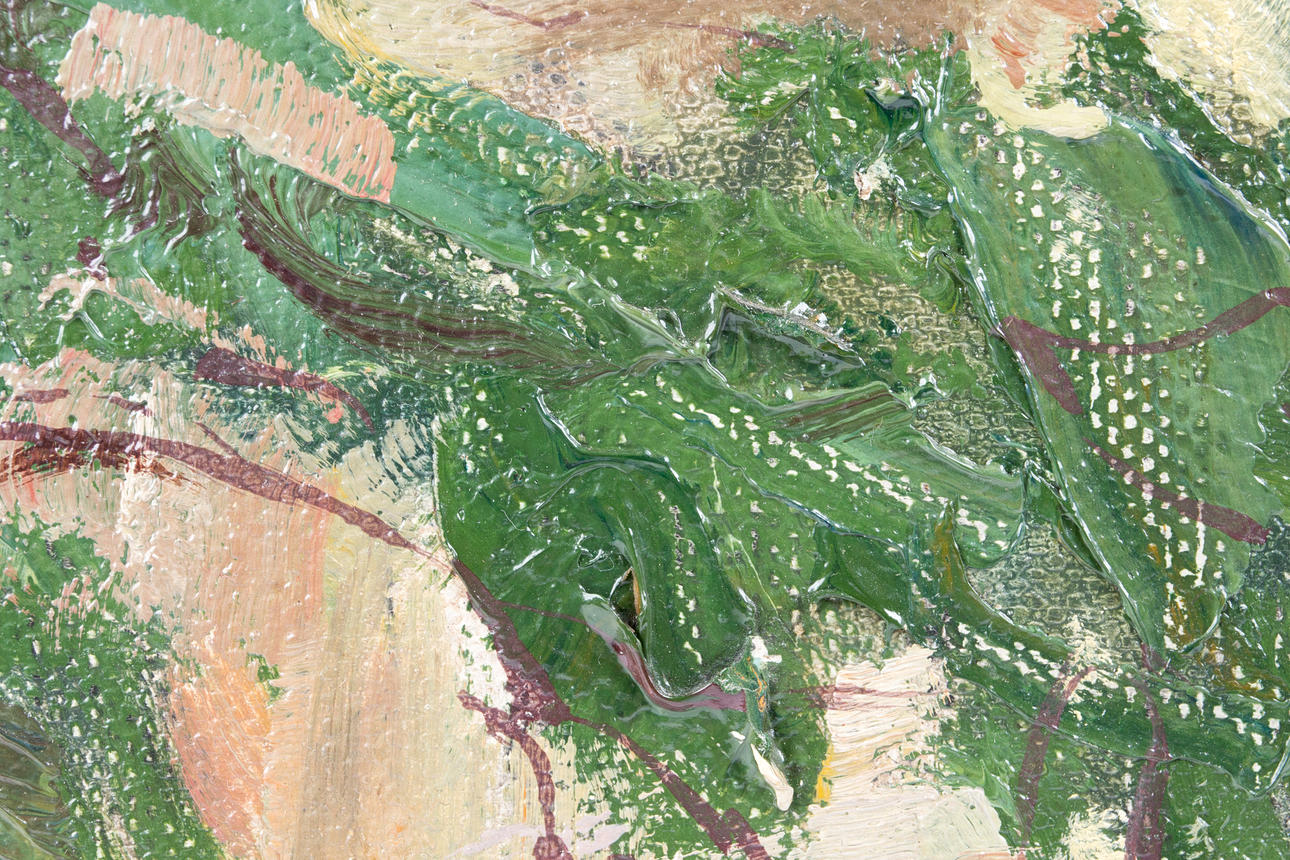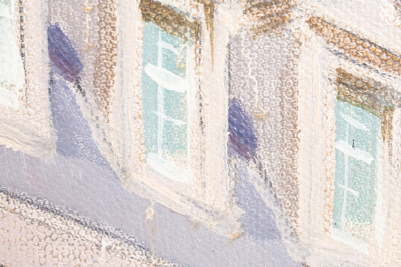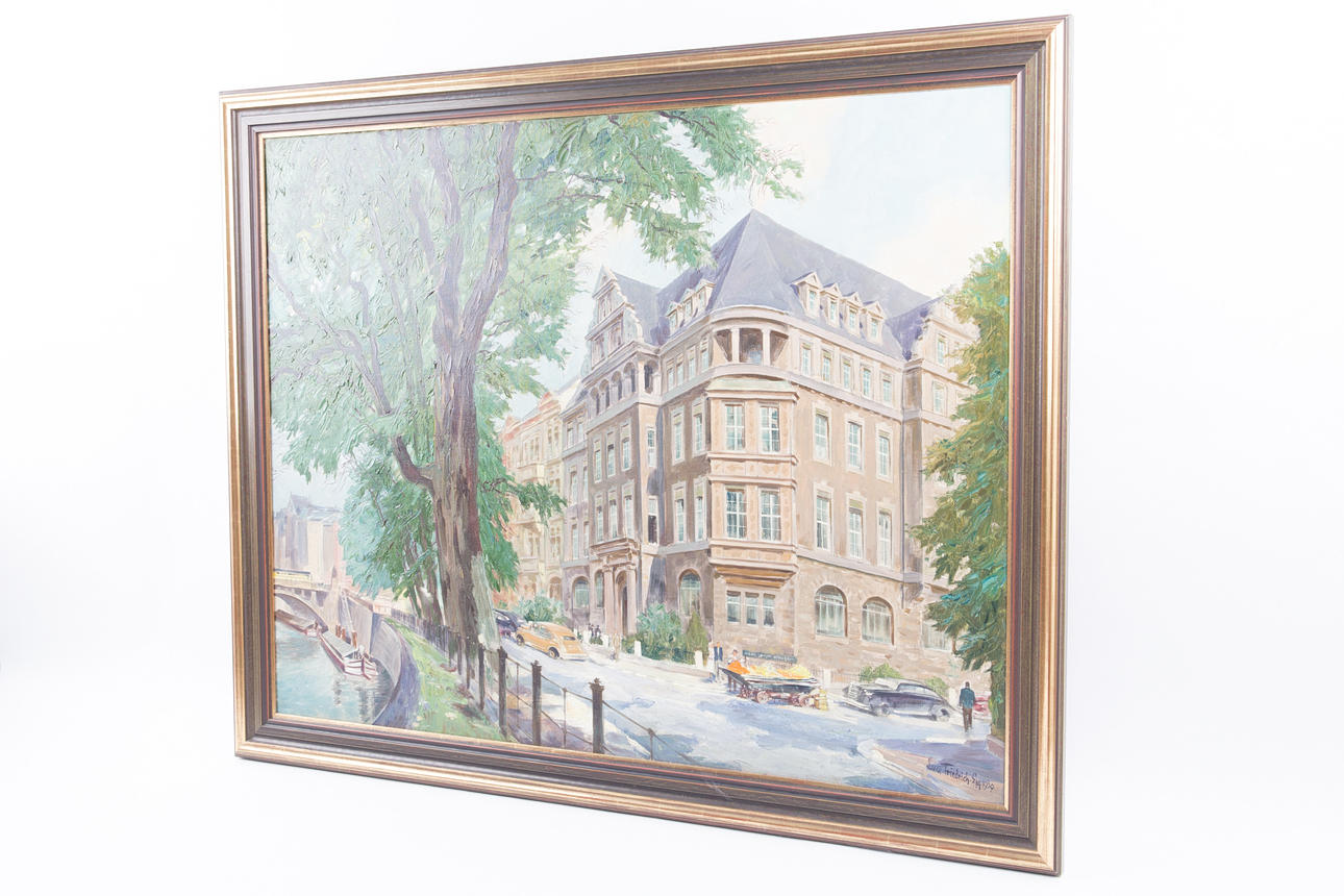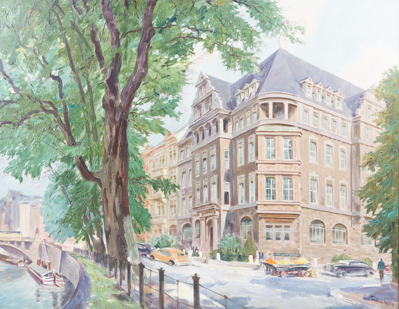 Hans Friedrich (1887-1967), Gemälde, Stadtansicht, Öl auf Leinwand, Leipzig, 1939. Darstellung eines sommerlichen Exterieurs mit einer Straße vor einer Häuserfassade zur Rechten und einem Kanal zur Linken, unten rechts signiert, datiert und topografiert, 120x156cm (141x177cm).