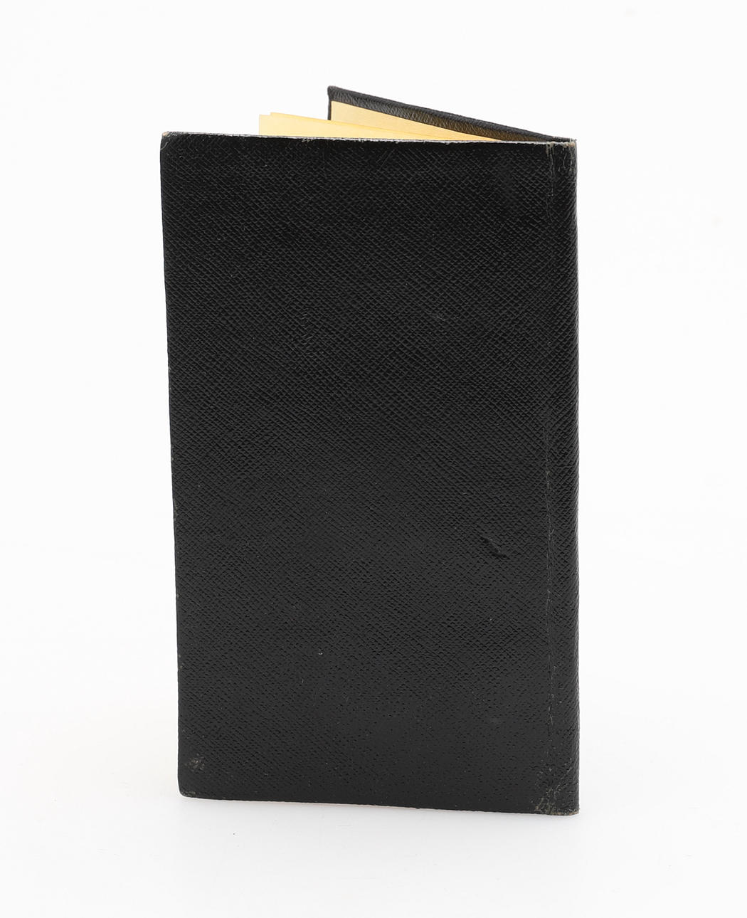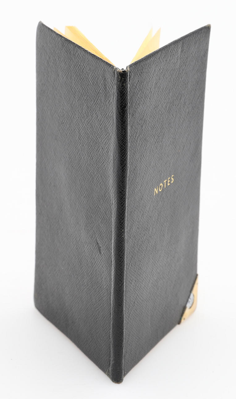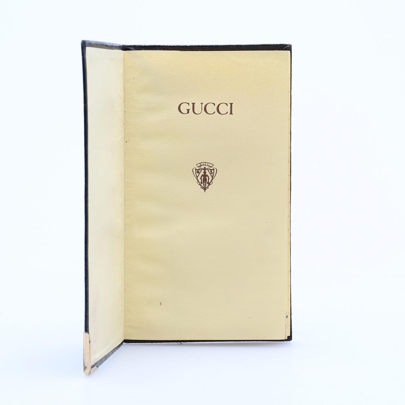 schwarzes, genarbtes Leder mit goldgeprägten „Notes“ und unterer rechter Ecke mit Gucci-Logo aus gold- und silberfarbenem Metall. Innen liniertes Buch, 14 cm x 8 cm.