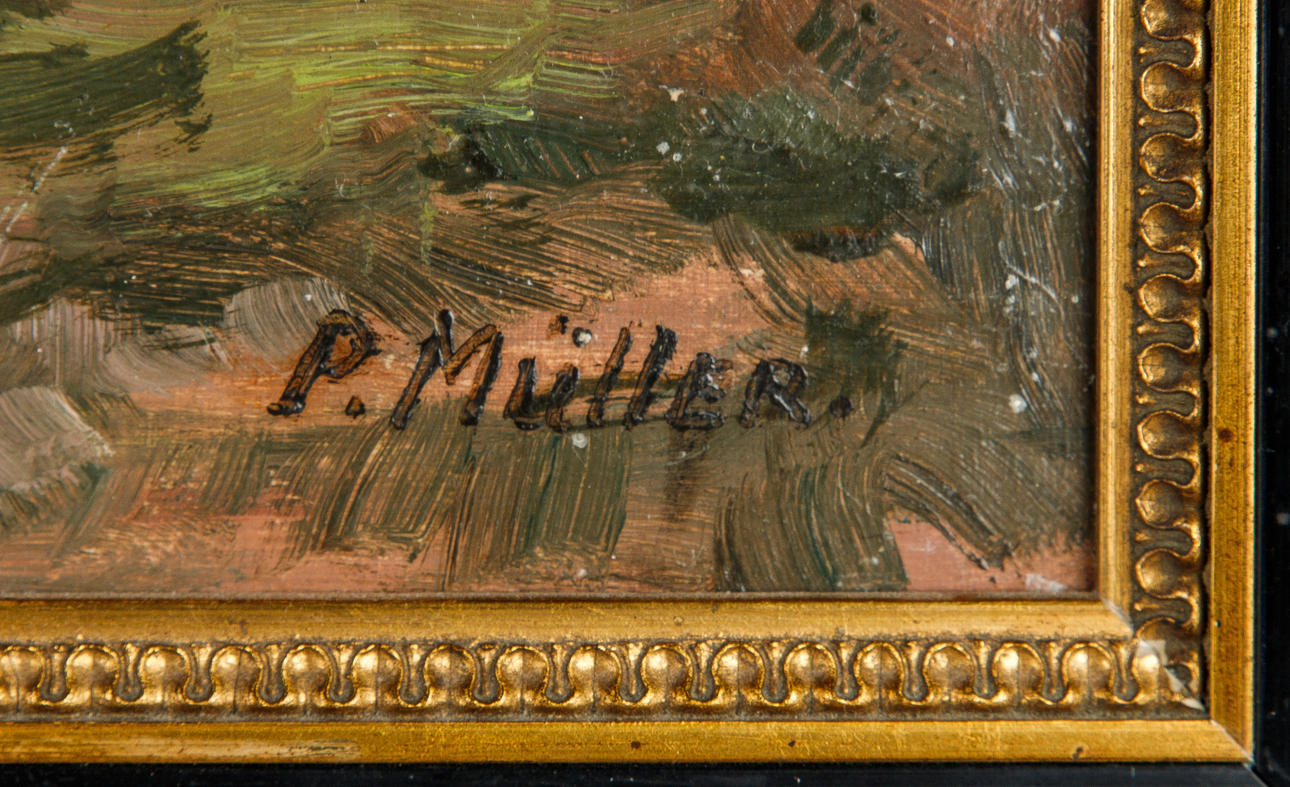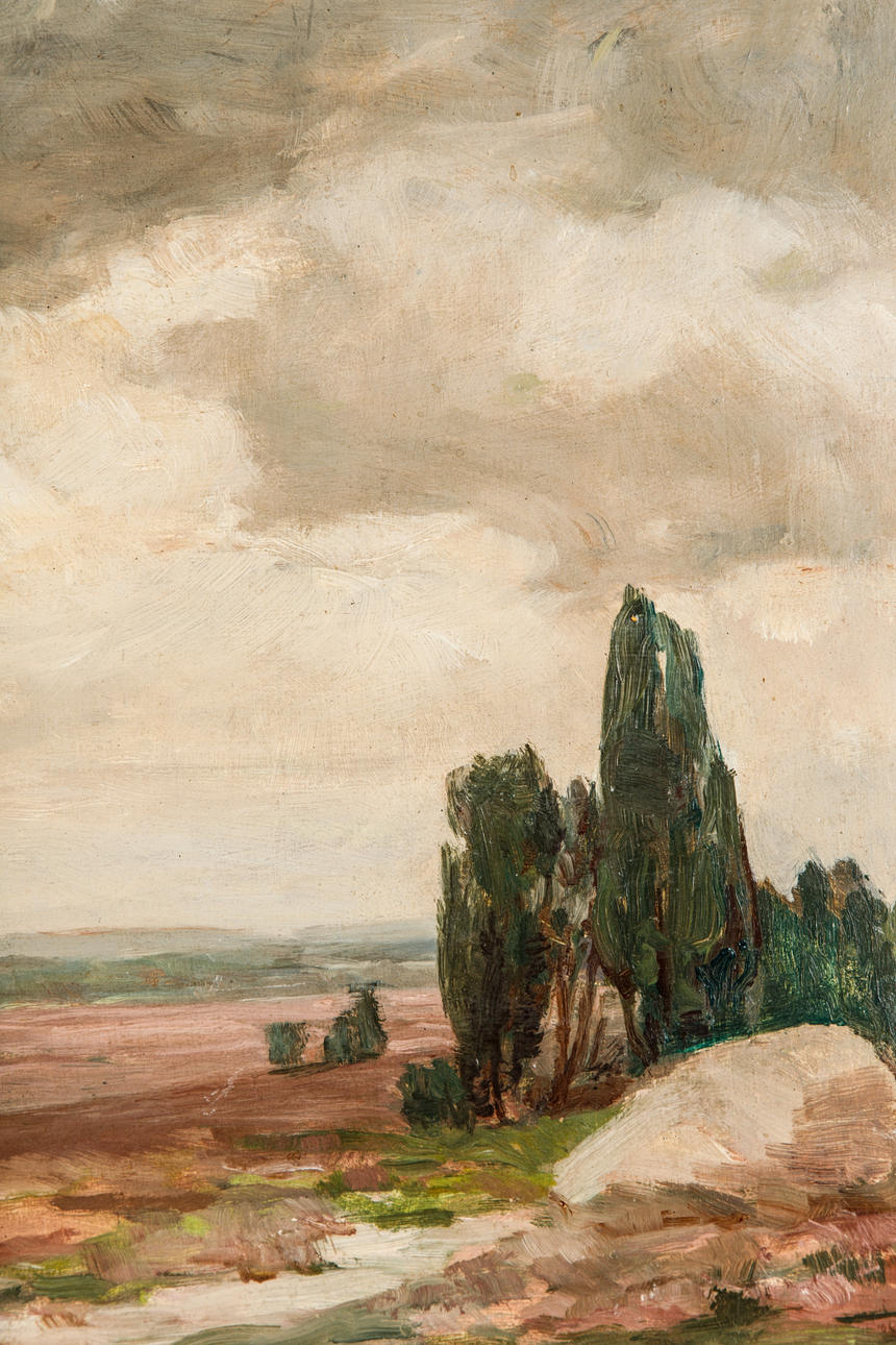 P. Müller, Heidelandschaft, Öl auf Hartfaserplatte, um 1950, signiert, ca. 43 x 56 cm, mit Rahmen ca. 57 x 70 cm.