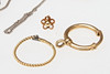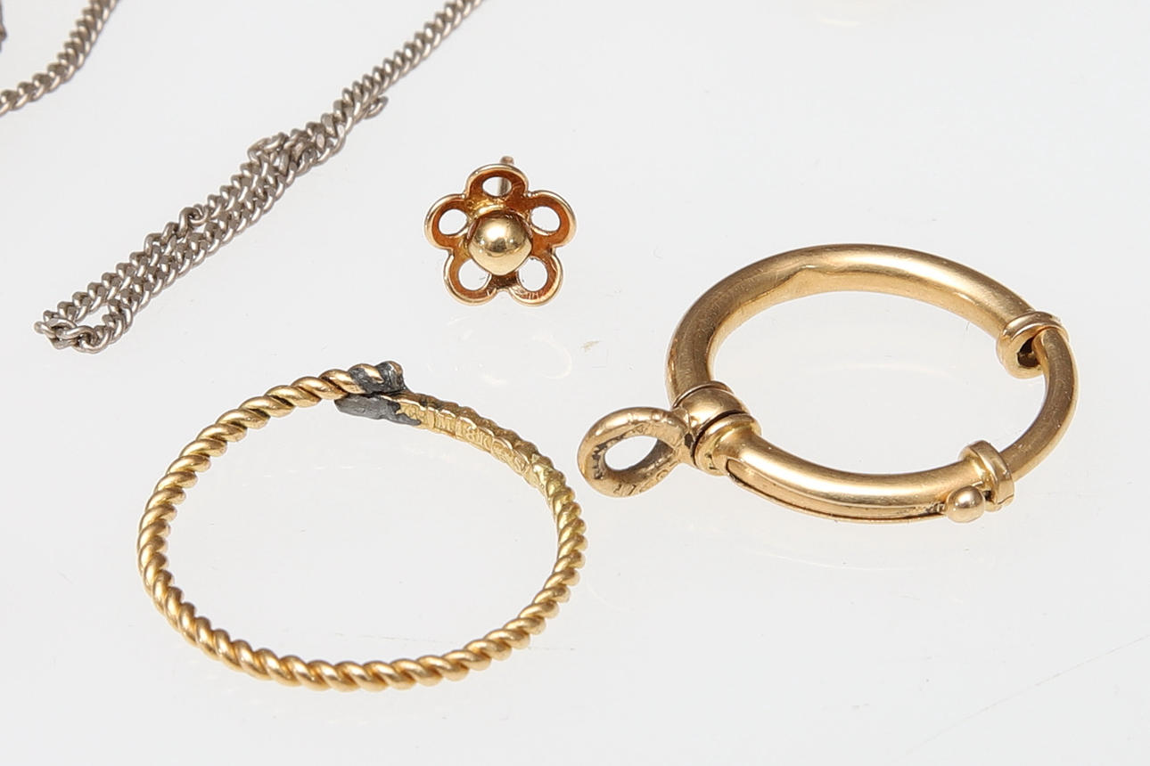 Altgold, 3 Teile, positiver Säuretest für 18K Gold, Ring gestempelt, Ring, Teil für Uhrenkette, Ohrring, Gewicht ca. 3,4 Gramm.
