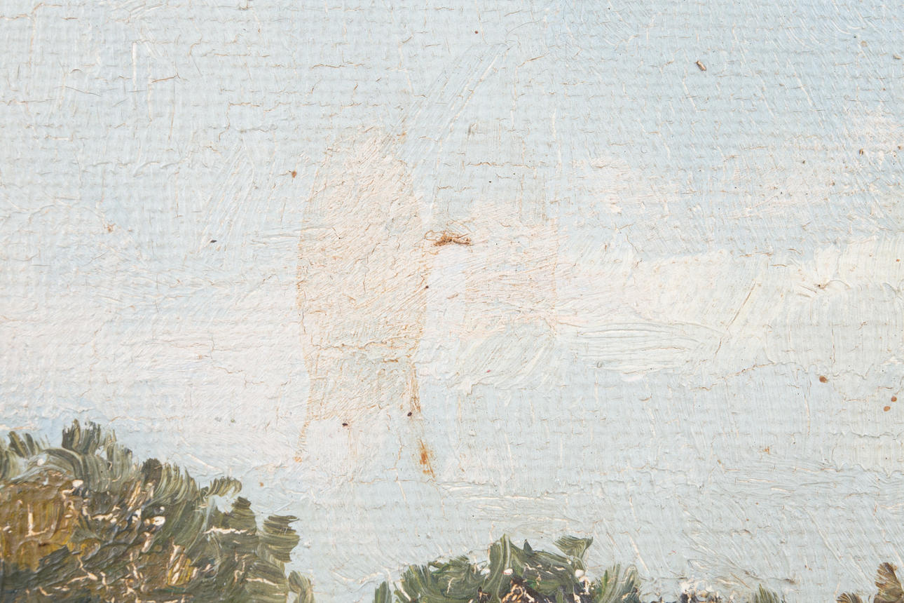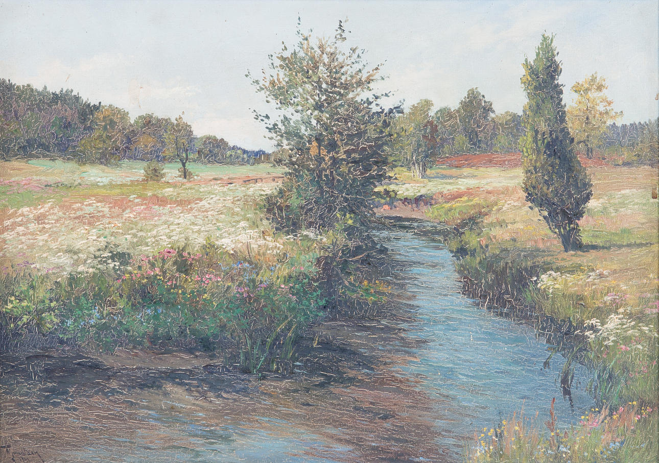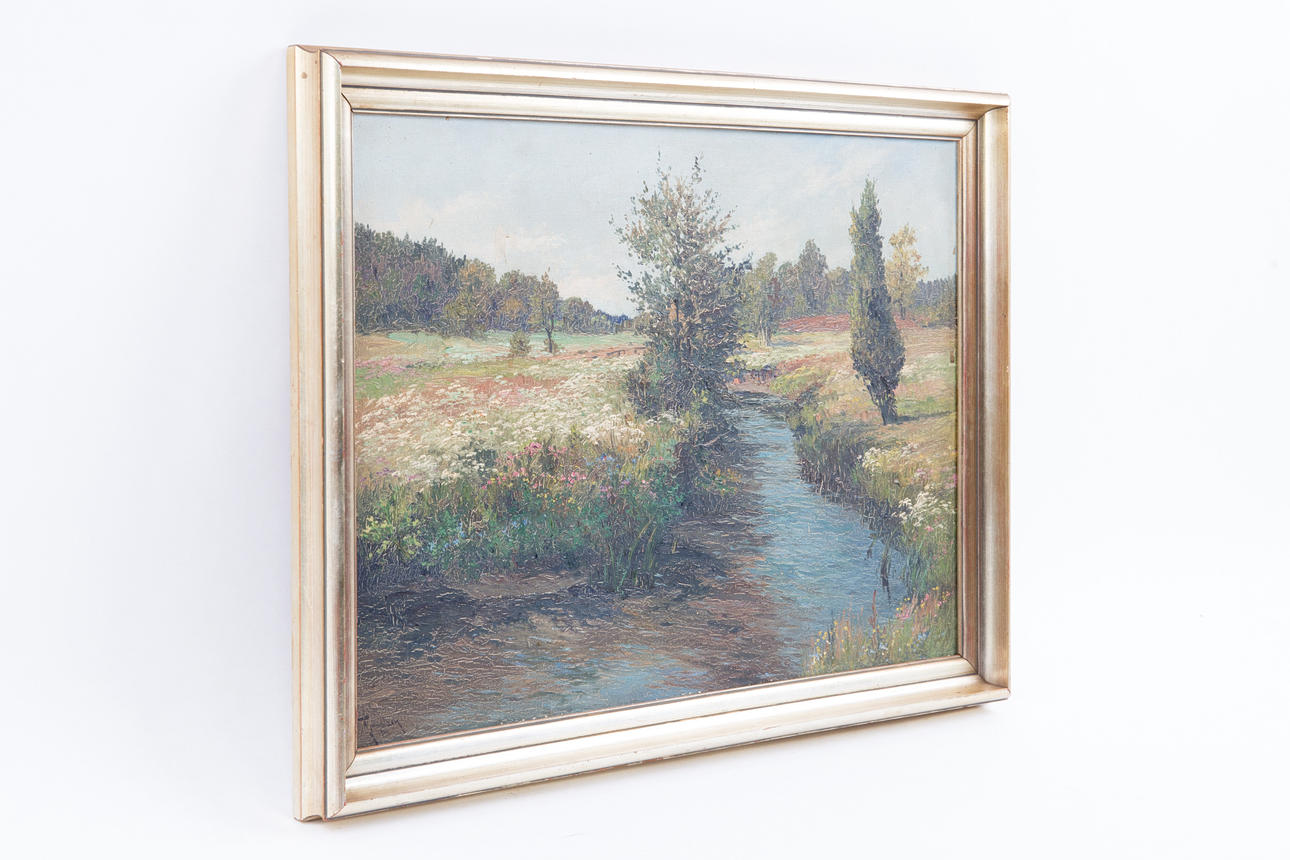 Henry Gundlach (1884-1965), Gemälde, Flusslandschaft, Öl auf Leinwand, 1941. Darstellung eines frühlingshaften Exterieurs mit einem mittigen Flusslauf zwischen Wiesen vor blauem Himmel, unten links signiert und datiert, 48x68cm (58x78cm).