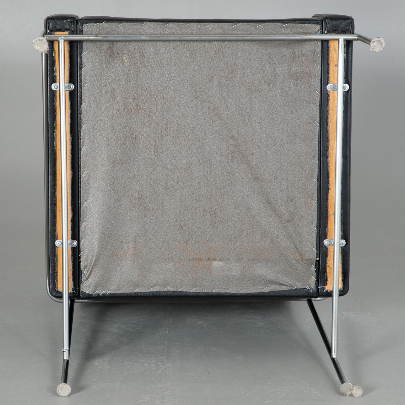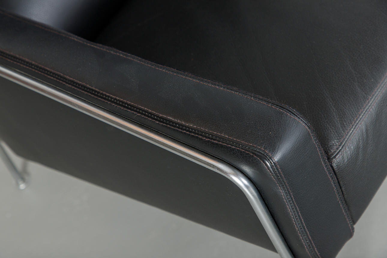Fritz Hansen. Entwurf: 1956. Stahlrohr. Bezug aus schwarzem Leder. HxBxTxSh: 72x70x75x41 cm. Der Sessel wurde vor geraumer Zeit neu bezogen.
