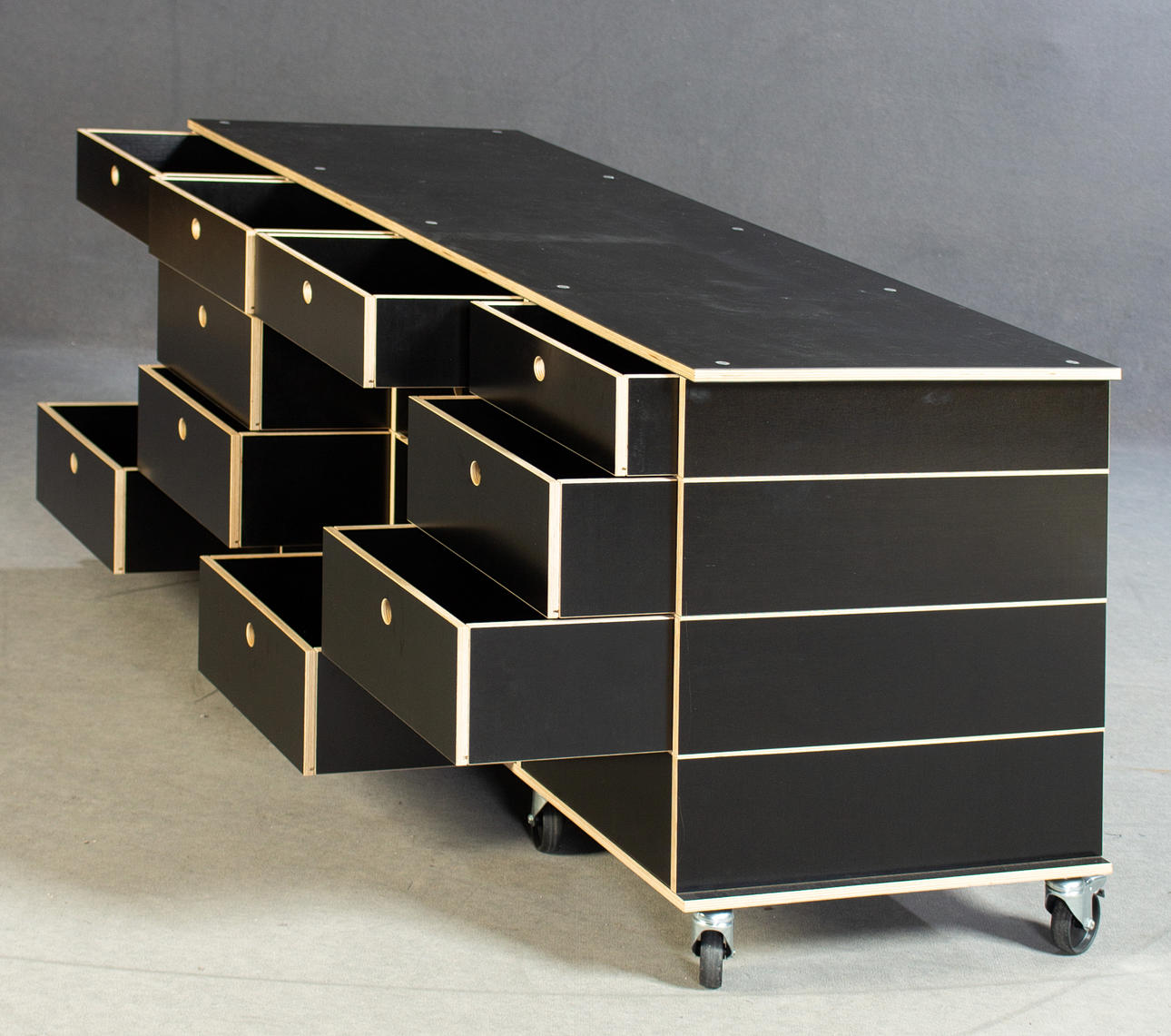 Deutsches Design. Entwurf: 1996. Modell 'Lader'. Sperrholz, Birke. Schwarzer Korpus. Auf Rollen, 2 davon mit Bremsfunktion. HxBxT: 69x160x51cm.
