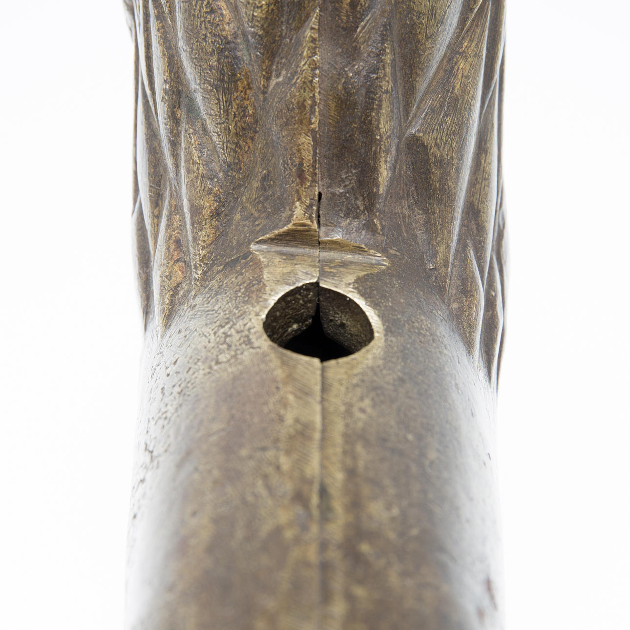 Figur / Skulptur, Löwe, Bronze. Bronzefigur mit der Darstellung eines liegenden Löwen, mit frontal nach vorne gerichtetem Blick, zweiteilig gegossen, Dübelloch auf dem Rücken, H.19cm, B.8cm, L.21cm.