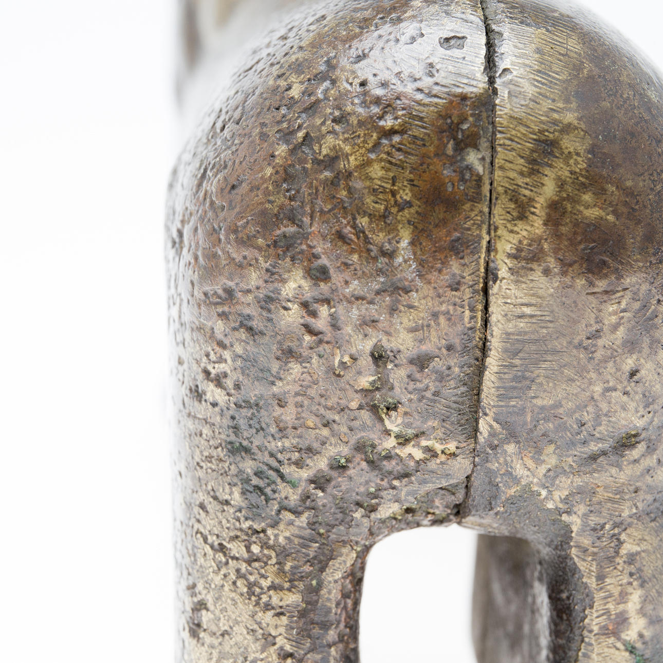 Altersgemäße Reibespuren, partieller Abrieb und Oxidationsspuren, Kratzer und Bestoßungen in der Bronze.