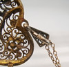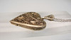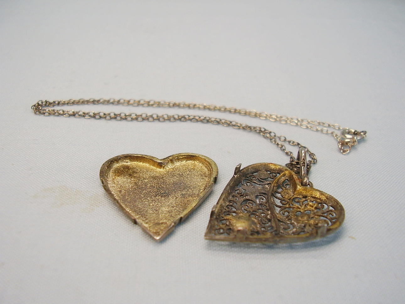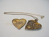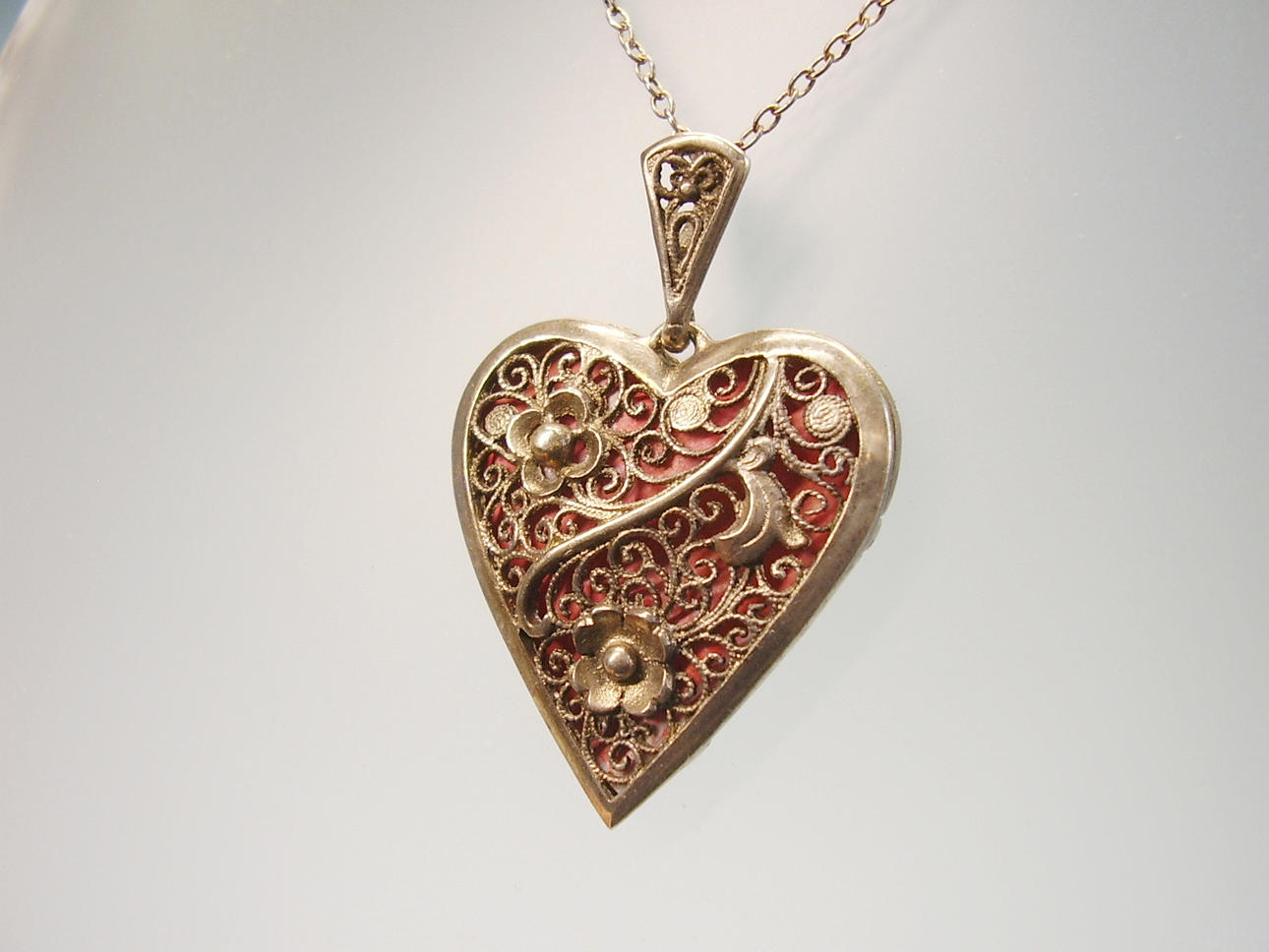 Medaillon in Herzform zum Öffnen mit Platz für Photos oder anderes. Die Vorderseite ist in Filigran-Arbeit floral verziert, die Rückseite ist glatt poliert.