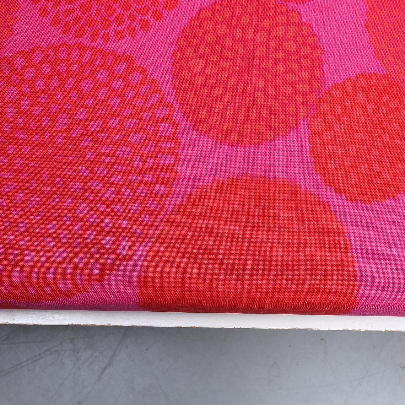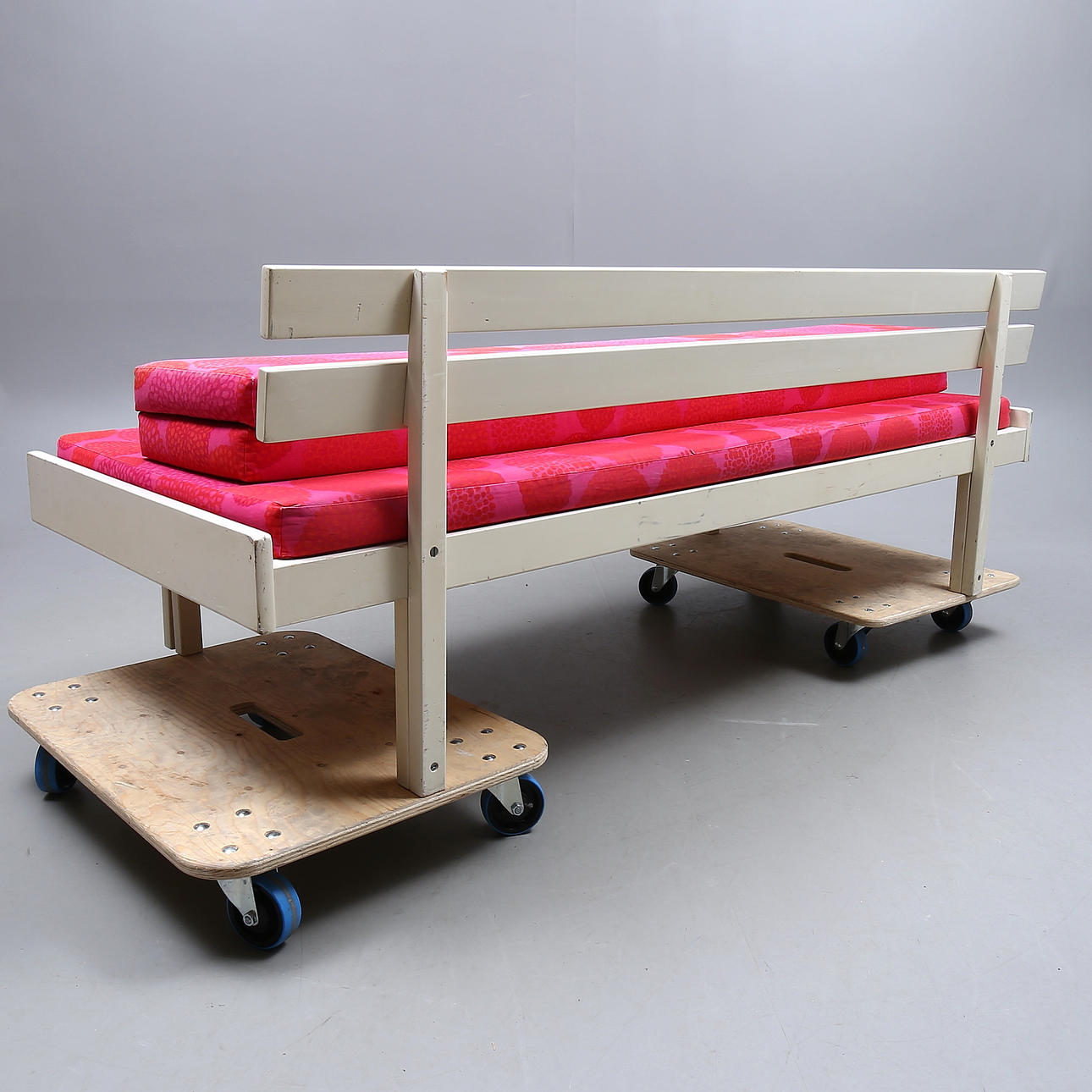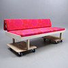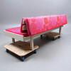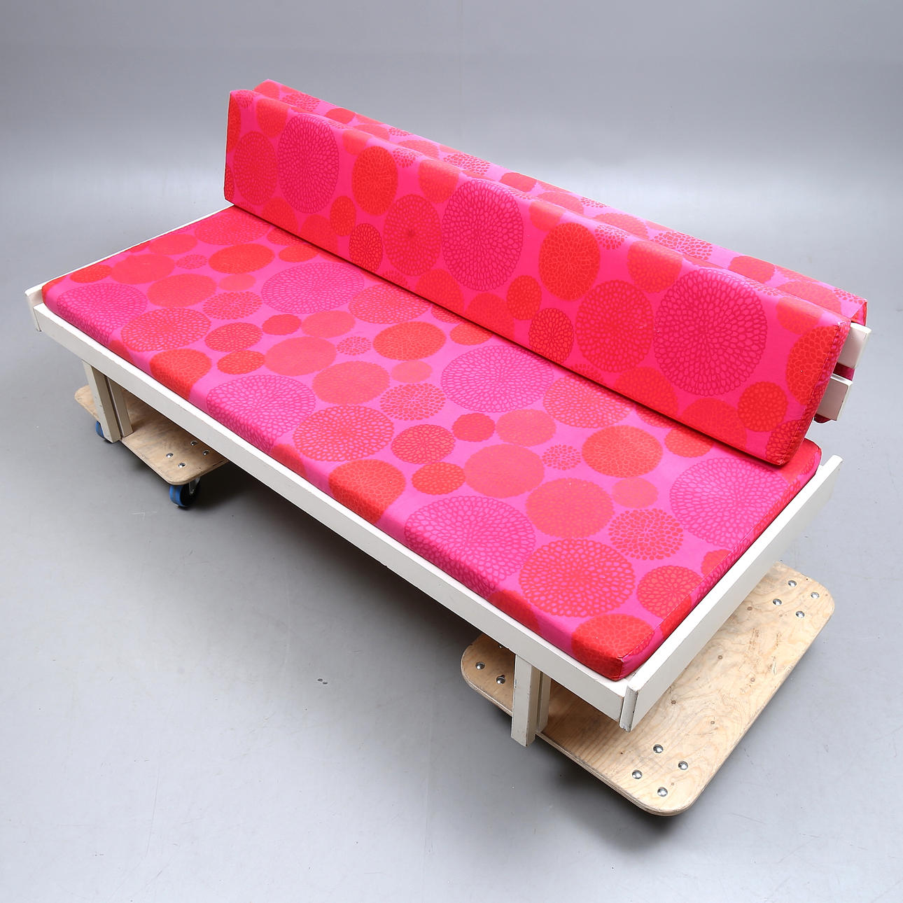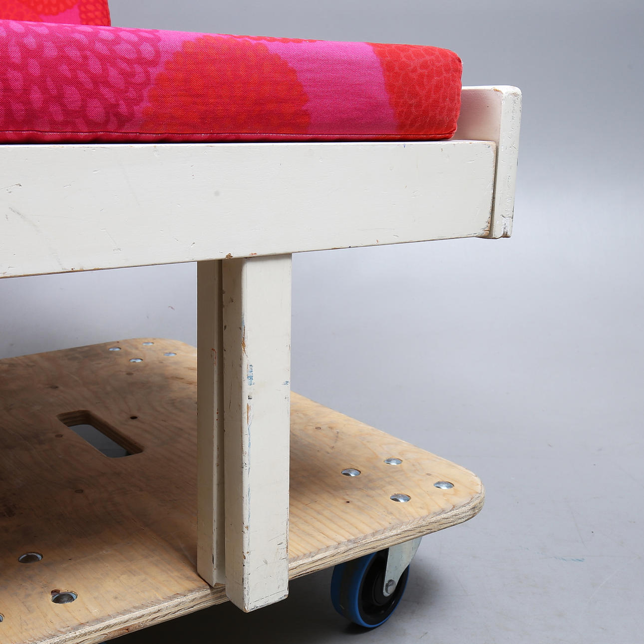 Rahmen mit Gebrauchsspuren, Farbverlust. Polsterung mit kleineren Beschädigungen, eher ausgeblichen.