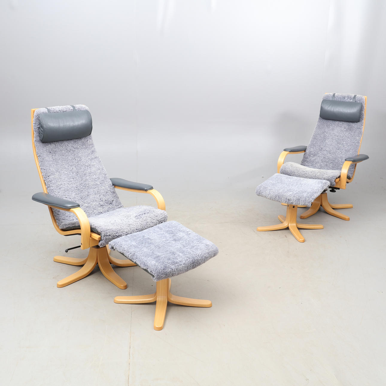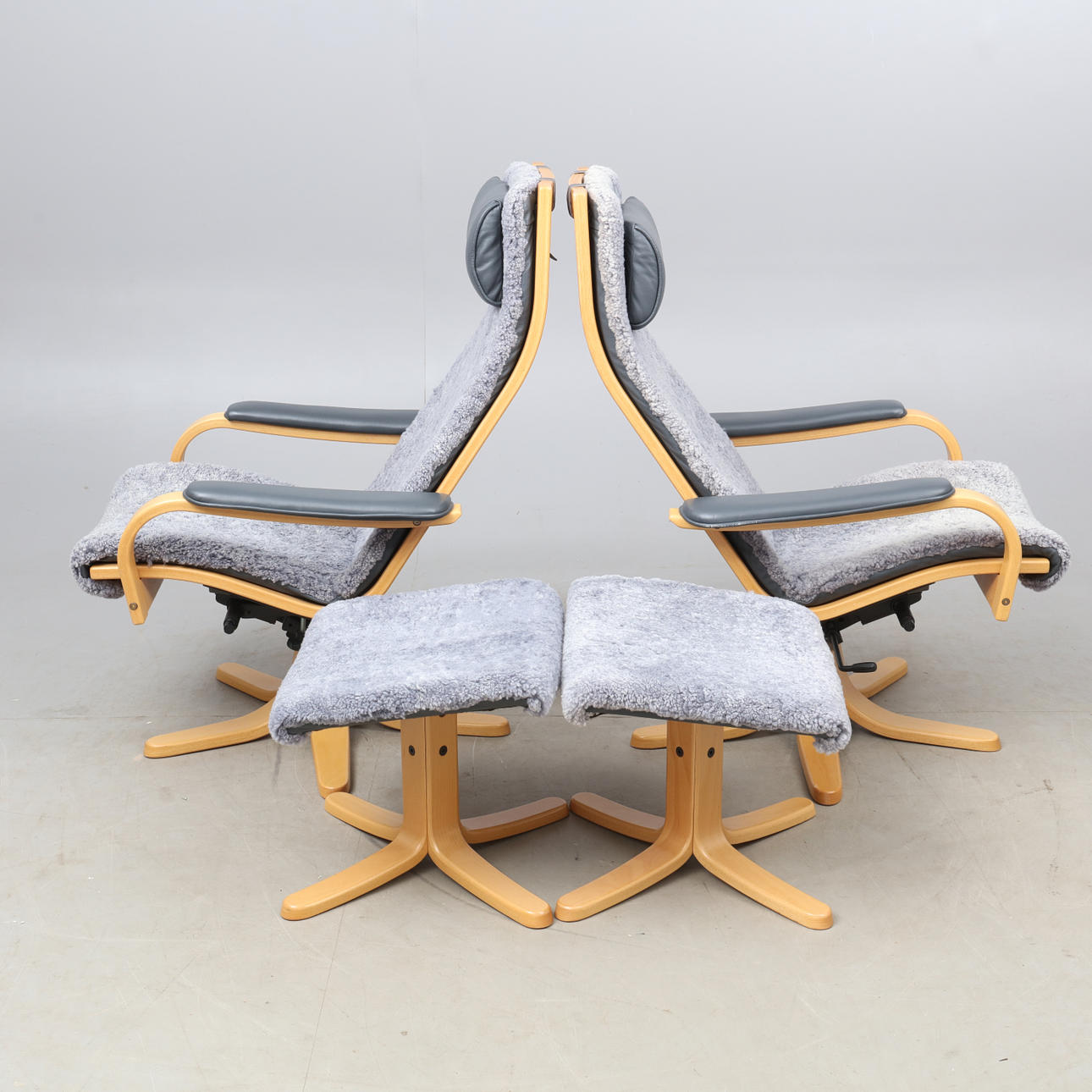 Söderbergs. Sessel mit Fußschemel, mit grauem Schaffell bezogen, Gestell aus Buche, Nackenkissen und Armlehnen mit grauem Leder bezogen.