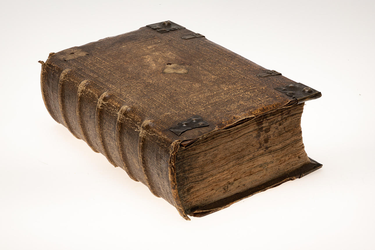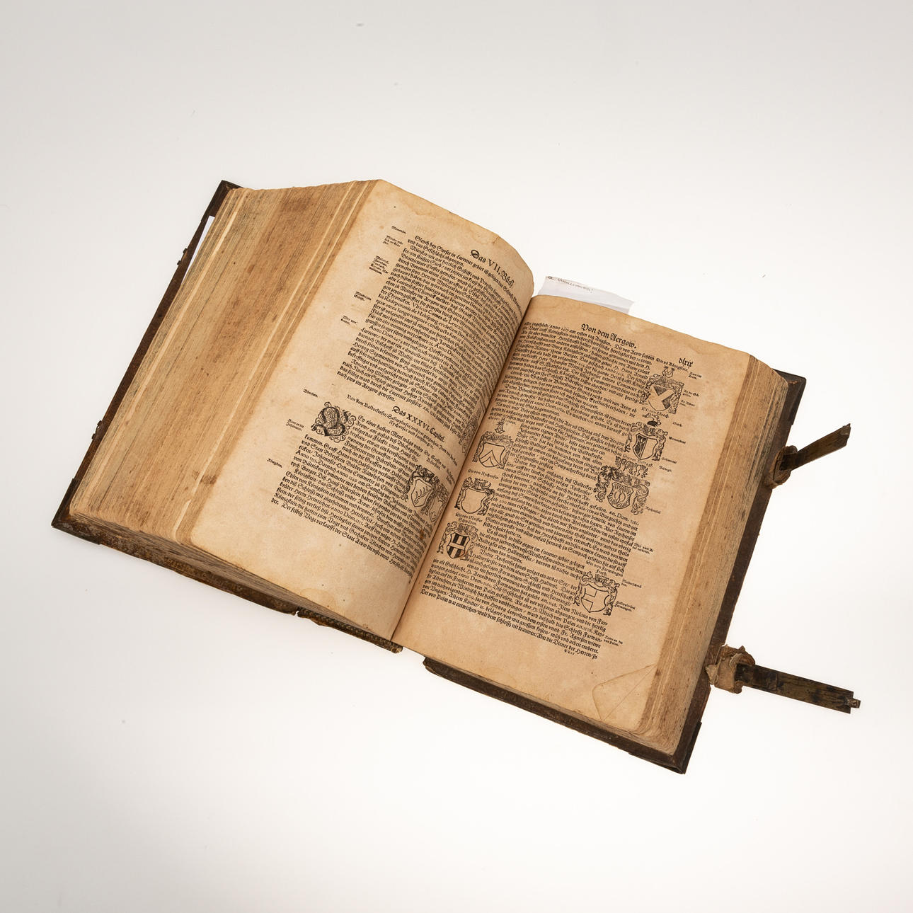 Johan Stumpf, Schweizer Chronik, Leder, Messing, Zürich, 1606. 'Schweytzer Chronick' aus dem Jahr 1606, Holzeinband auf fünf Bünden mit blindgeprägtem Schweinsleder bezogen und partieller Streicheisenverzierung, mit zwei Messingschließen versehen, dritte und letzte Ausgabe der bedeutendsten gedruckten Schweizer Chronik des 16. Jahrhunderts, 1548 erstmals erschienen und bis 1606 korrigiert und erweitert, mit fünf doppelblattgroßen und acht blattgroßen Holzschnitt-Karten, sowie verschiedenen Textholzschnitten von H. Asper, H. Vogtherr, R. und J. Wyssenbach und anderen, L.36cm, B.26cm, T.12,5cm.