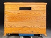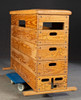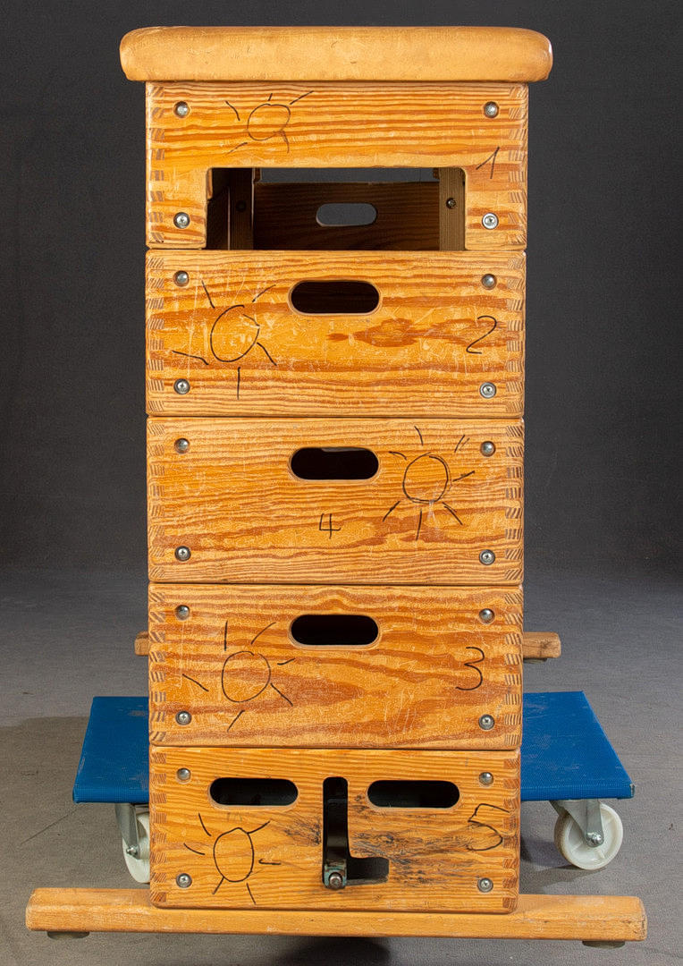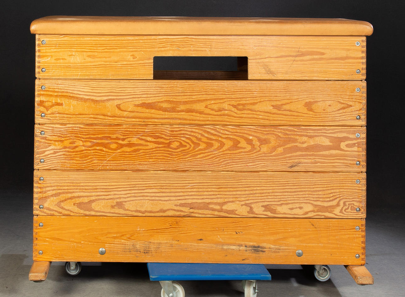 Holz. Kasten aus 5 Elementen, auf Rollen, Deckel mit Lederbespannung. HxBxT: 107x75x142 cm.