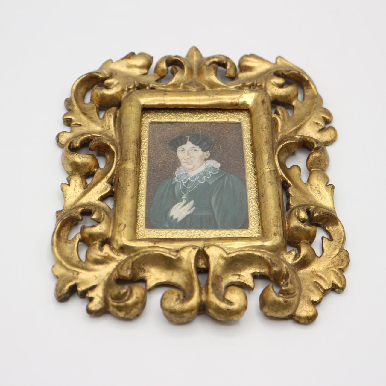 Portrait einer Adeligen Dame, gemalt auf Elfenbein, Barocker Handgeschnitzter Rahmen, vergoldet. 18 JAH.