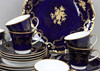 8 dreiteilige Gedecke mit Kaffee- und Untertasse sowie Kuchenteller, kobaltblau glasierter Rand mit goldenem Heckerosen Dekor und Goldrand dazu ein ähnlich verzierter Kuchenanbietteller, ges. 26 Teile.