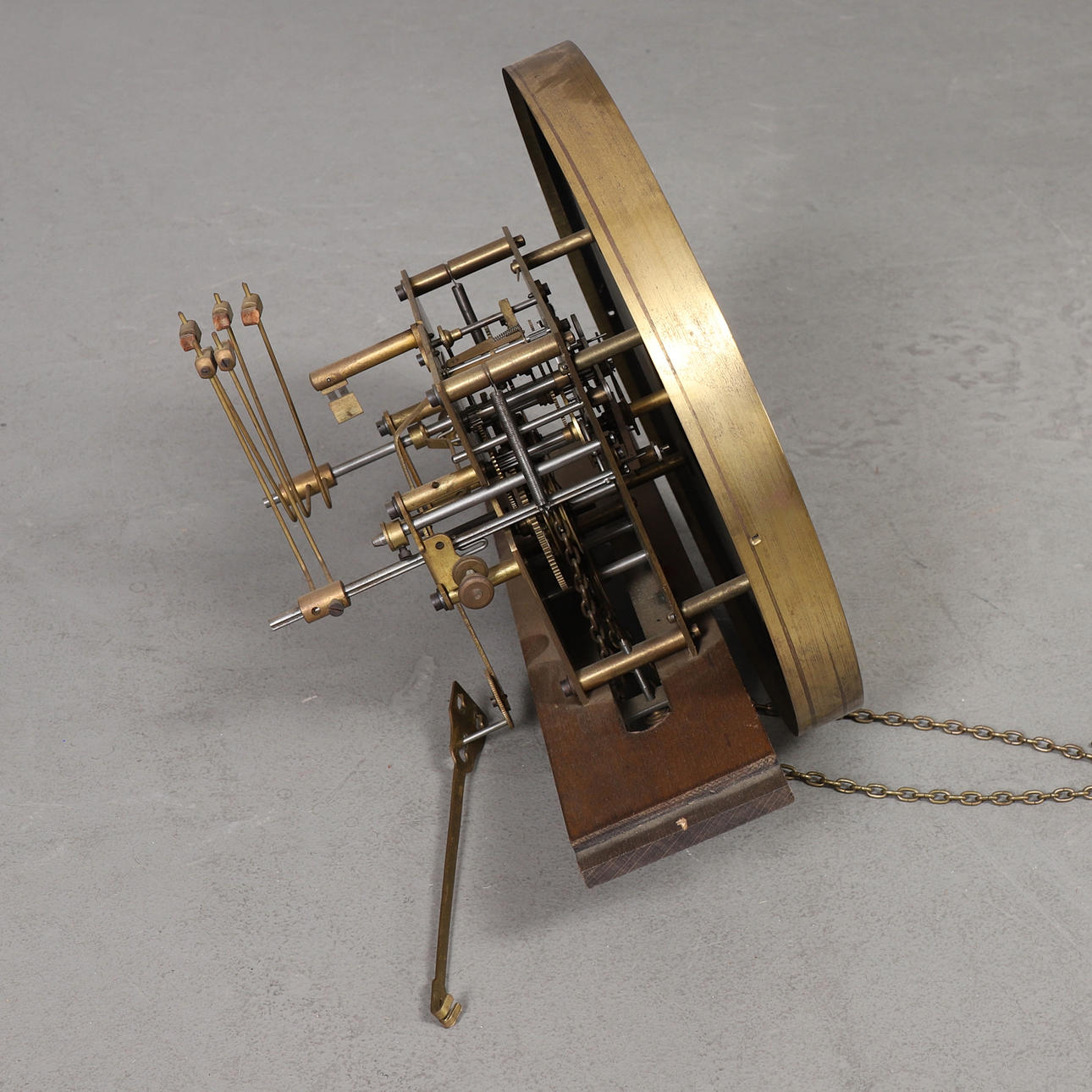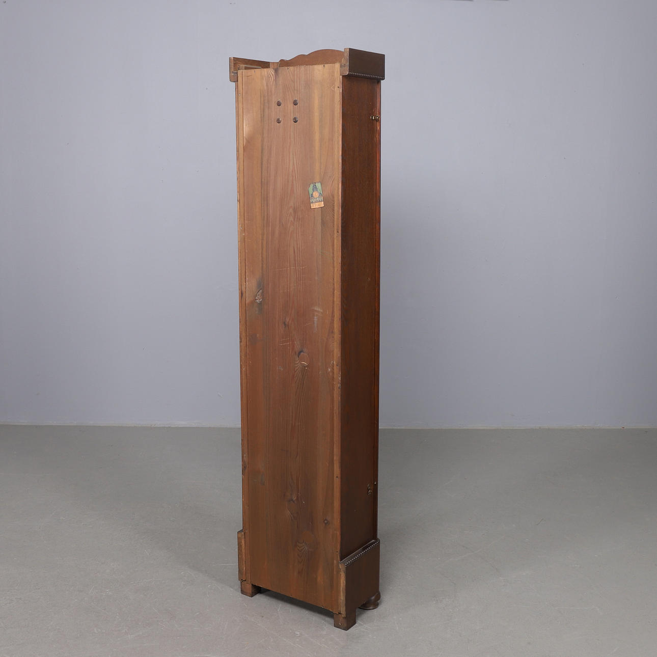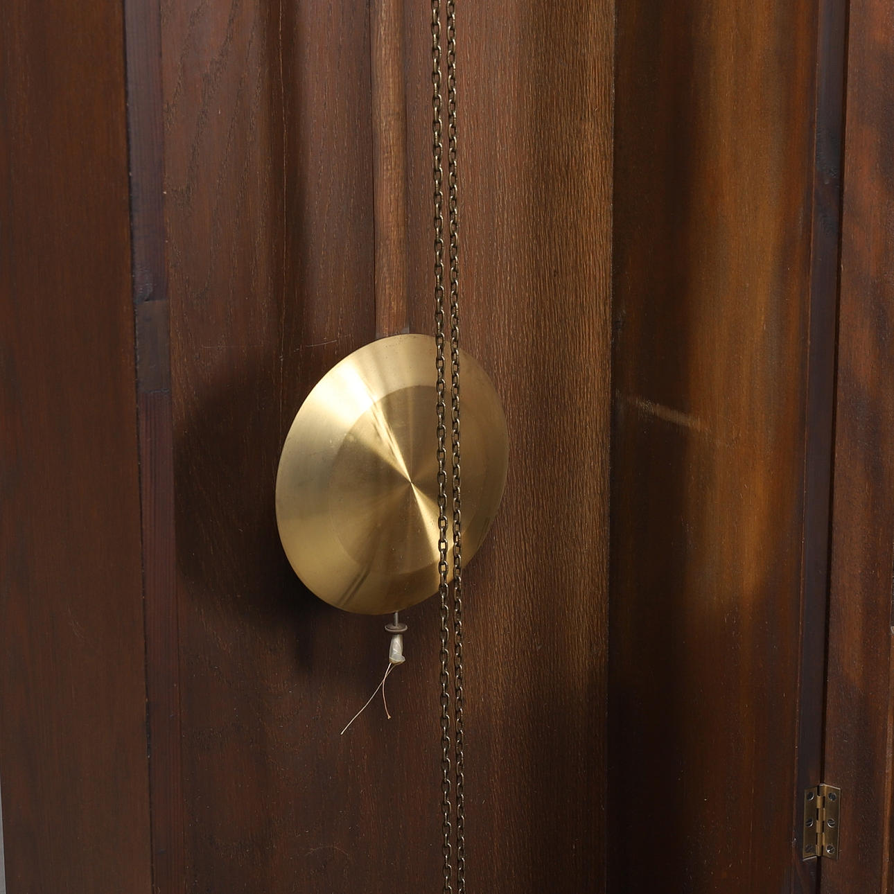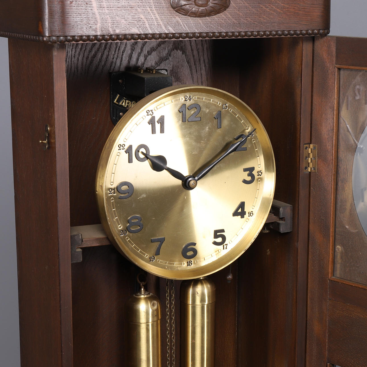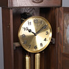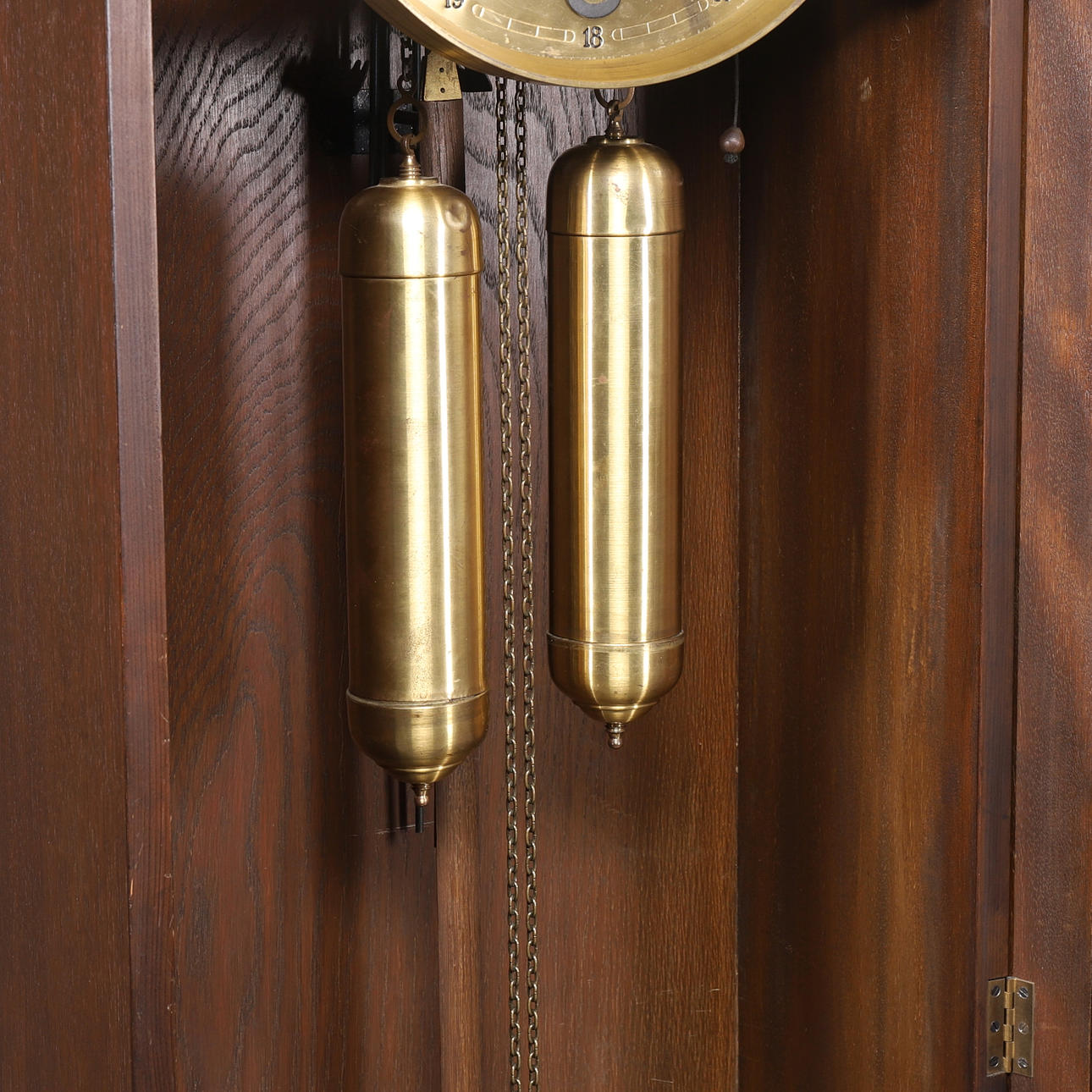 Zifferblatt aus Messing, Gehäuse aus dunkel gebeizter Eiche. Höhe 197 cm, Breite 46 cm, Tiefe 24 cm.