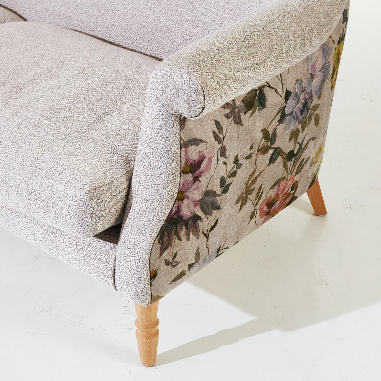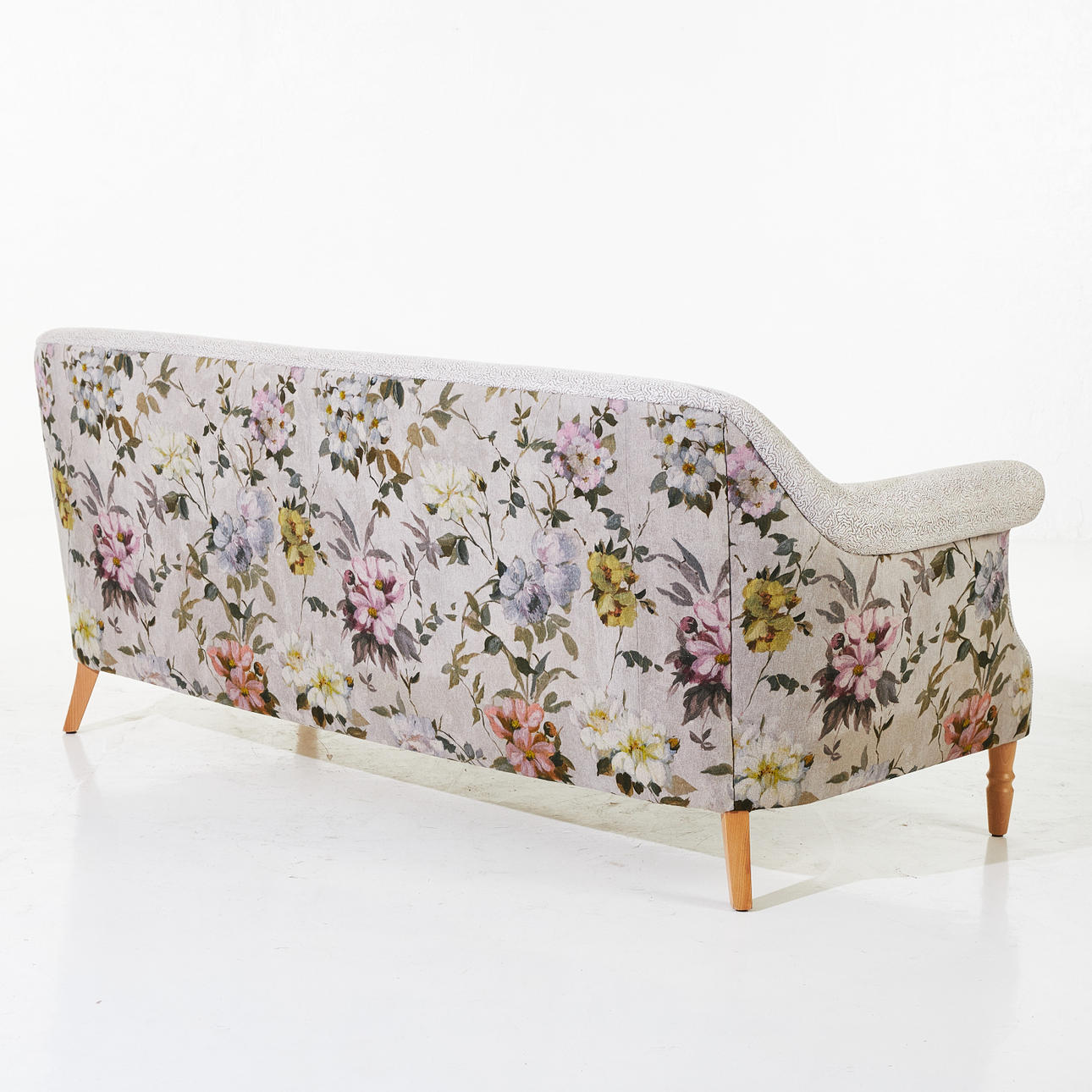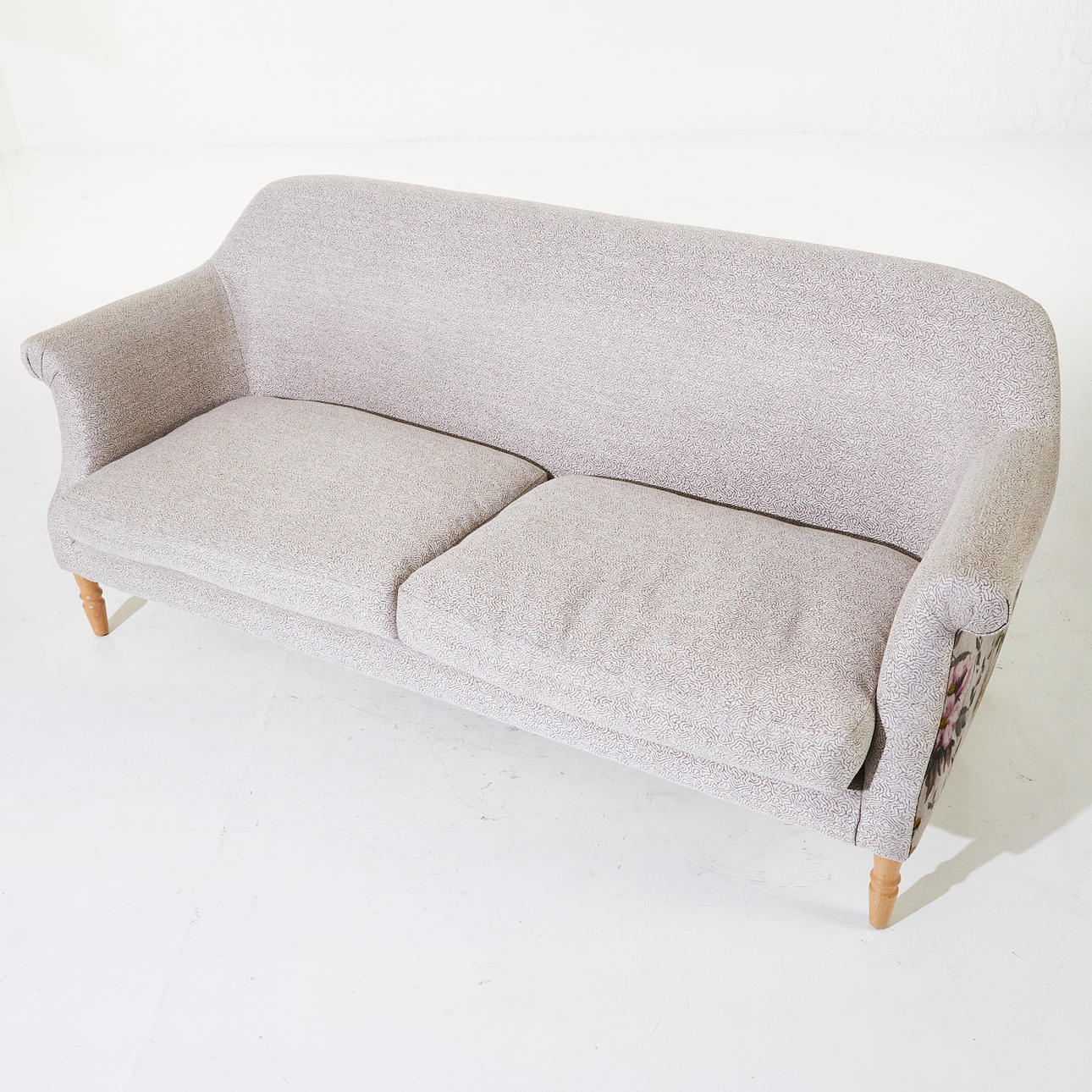 Kopfteile mit floralem Stoff bezogen, andere Teile in einem anderen, lockeren Federbusch, Sitzhöhe ca. 43, Länge 200 cm.