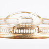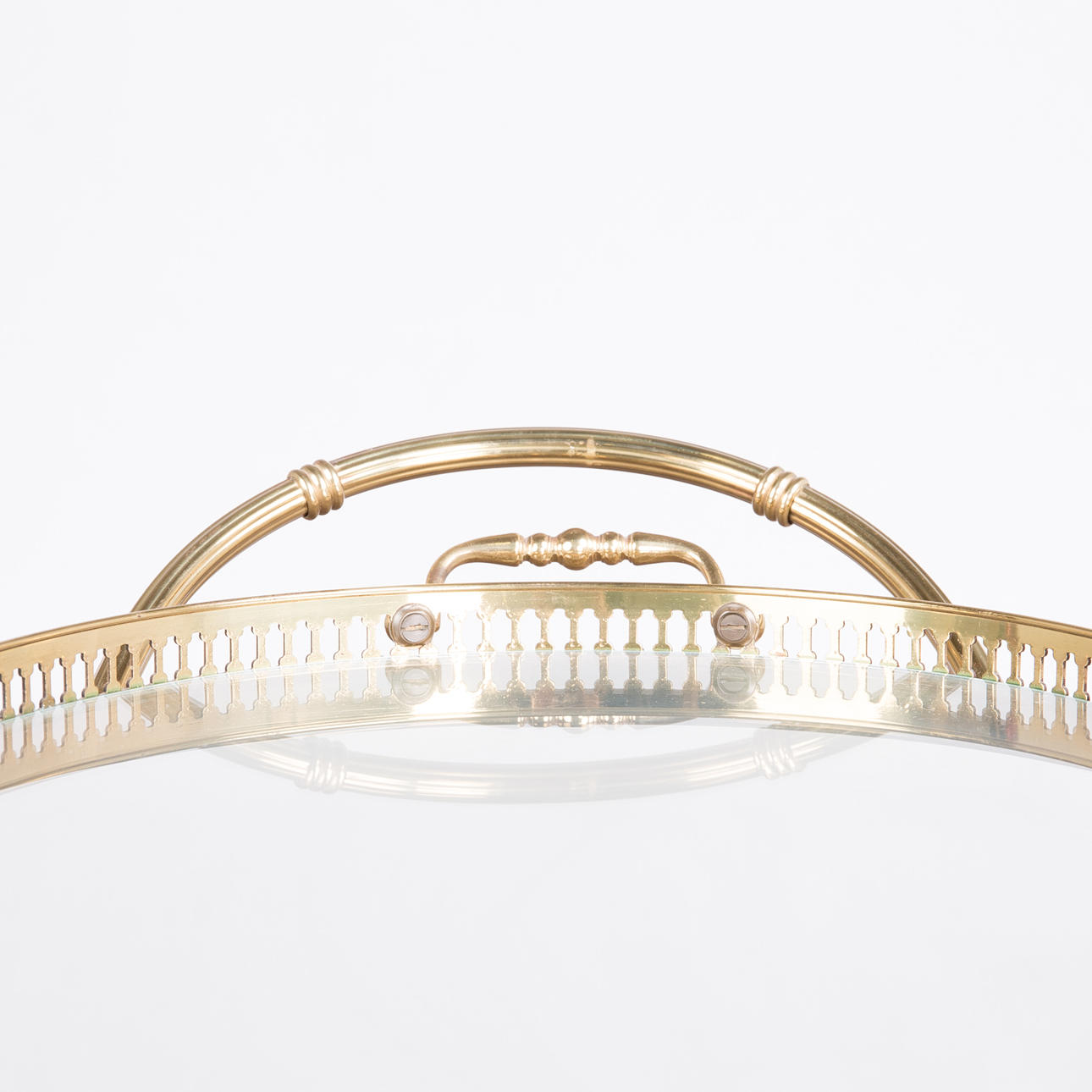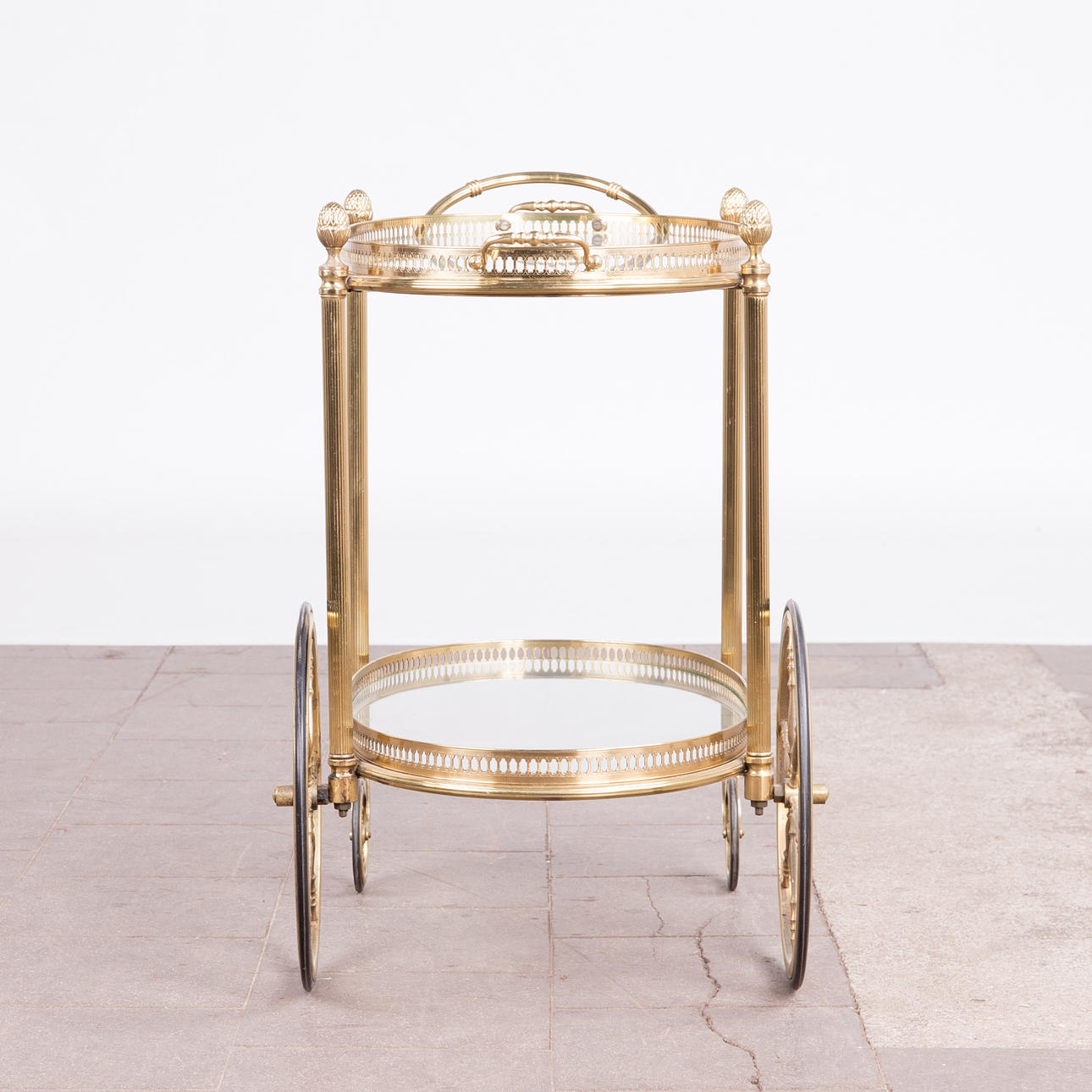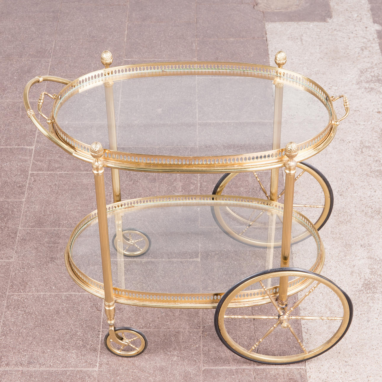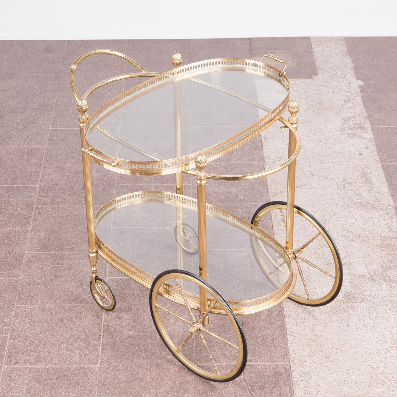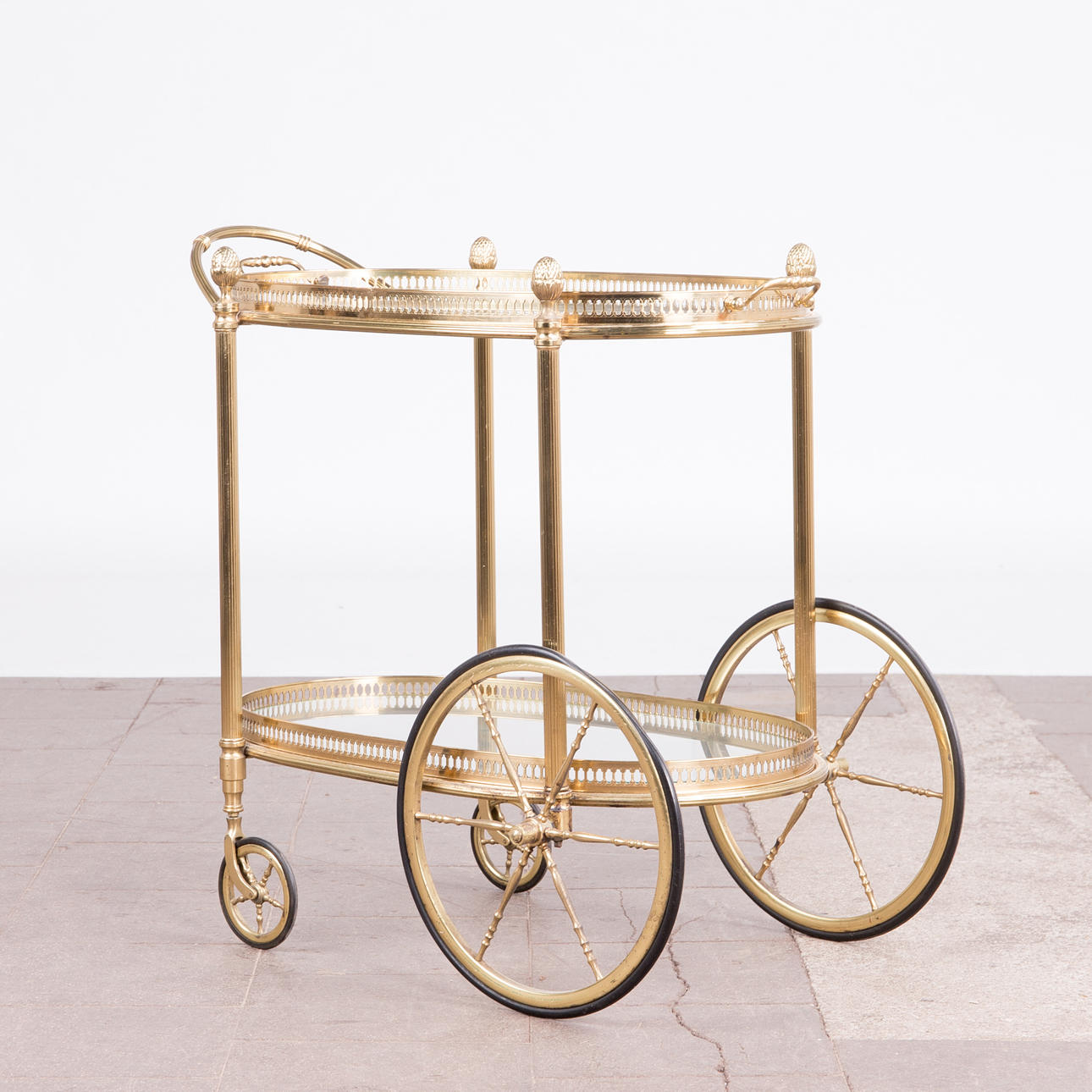 Barwagen / Servierwagen, Messing, Glas. Konstruktion aus Messing mit zwei ovalen Ebenen aus Glas, obere Ebene lose eingesetzt, mit einem verzierten Messingrand, sowie seitlich mit zwei Griffen versehen, H.66cm, L.71cm, B.40cm.