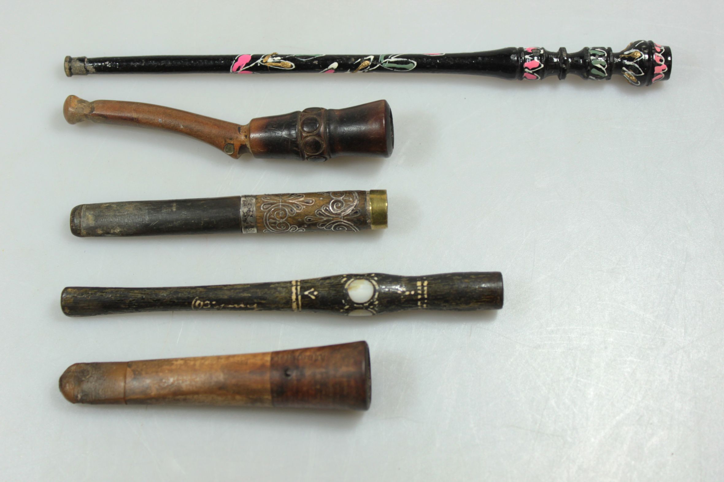 188509. FÜNF ZIGARETTENSPITZEN, Holz, Perlmutt, Metall, Silber.
