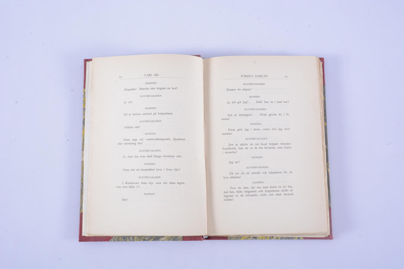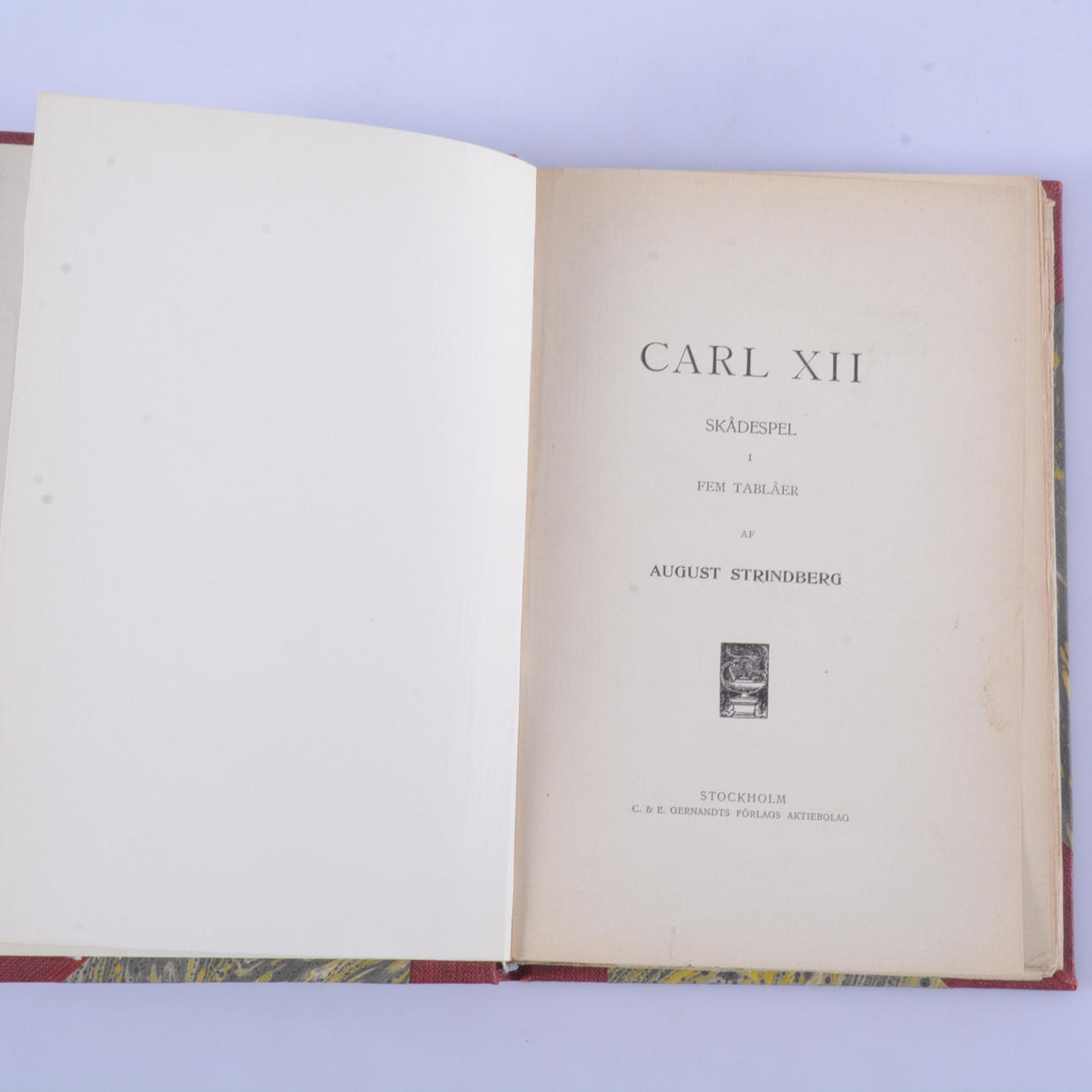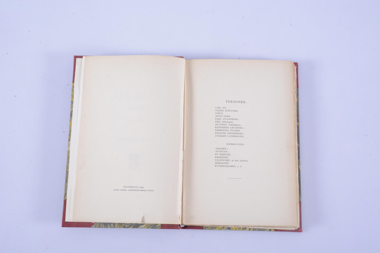 Trindberg, August, schwedischer Schriftsteller (1849-1912). Karl XII. Spielen Sie in fünf Tableaus. C. & E. Gernandts Verlag, Stockholm, 1901. Erstausgabe.8vo in einem roten halbfranzösischen Einband mit vergoldetem Rückentext und marmorierten Einbänden. Umschläge zusammengebunden. 169 S.