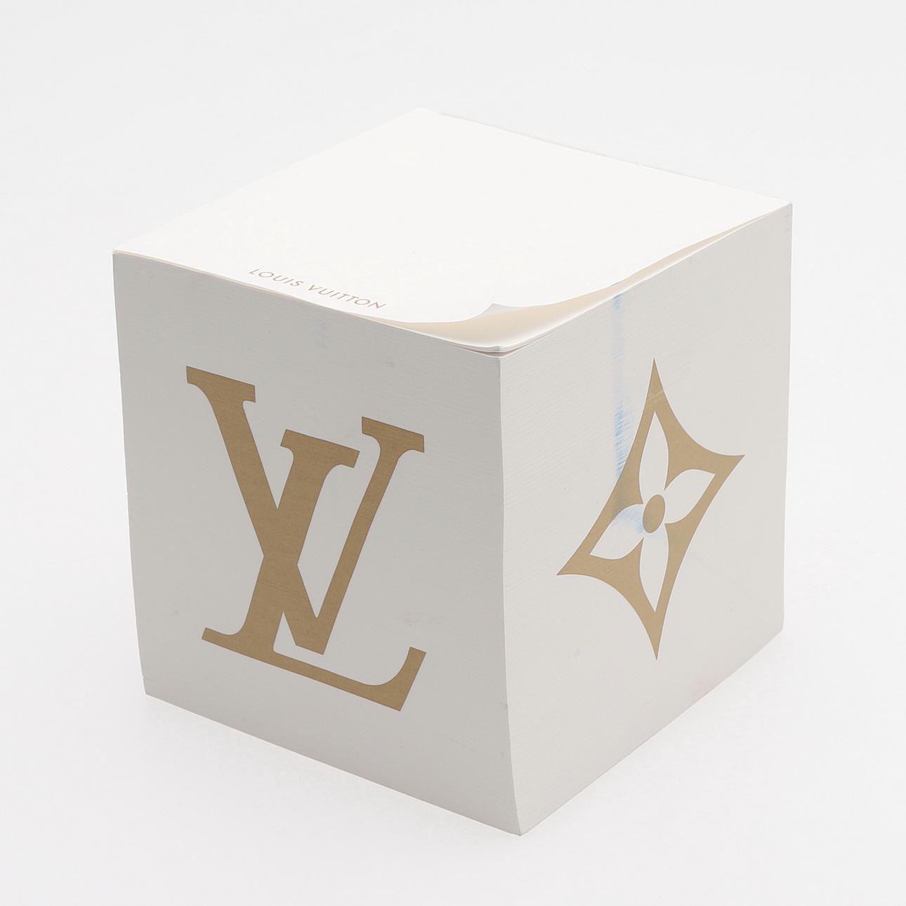 In Form eines Würfels, mit goldfarbener Verzierung und der Aufschrift Louis Vuitton. Höhe ca. 9,5 cm, 9x9 cm. Tasche enthalten.