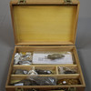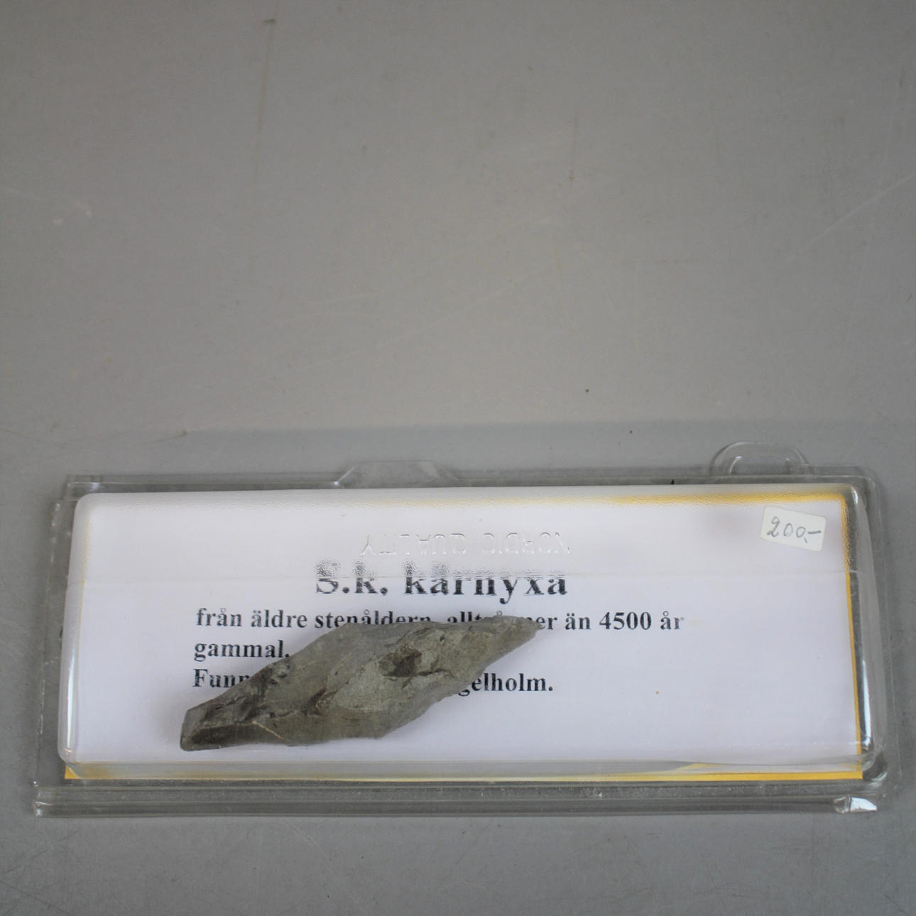 Beschreibungstexte auf Etiketten, Angaben laut Einreicher, u. a. Kernbeil Altsteinzeit, Flintbeil Altsteinzeit, Leimportaxt Altsteinzeit, sowie Schaber, Pfeilspitzen etc.