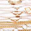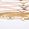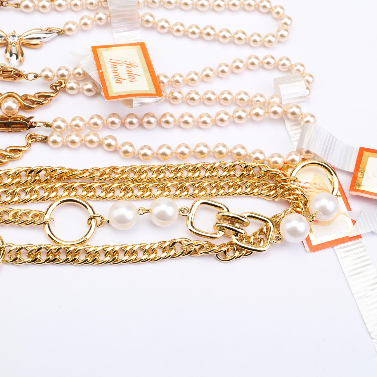 Fünf Halsketten mit Kunstperlen und Verschlüssen, Ketten und anderen Details aus plattiertem Metall, doppelt vergoldet.